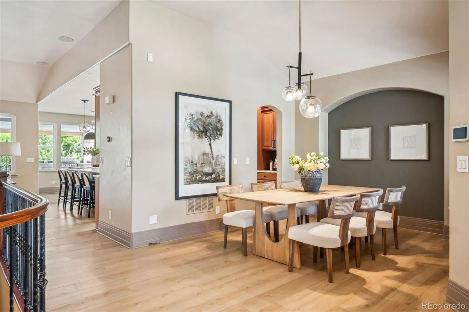 Enjoy a private office, formal dining, and an open-concept living and kitchen area ideal for entertaining. The chef’s kitchen impresses with double islands, quartz countertops, double ovens, gas cooktop, ample storage, walk-in pantry, and a butler’s pantry connecting to the dining room. A custom electric fireplace and picture window highlight the adjacent living room, with views of the covered deck and beautifully manicured yard.