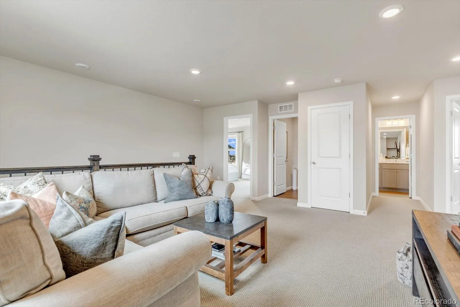 Welcome to 17867 Herrera Dr in the highly desirable Anthology North community. Built in 2023, this 4-bedroom, 3-bath home feels brand new and sits on a premium lot backing to open space and park views—a rare find. Offering over 3,600 sq ft with a full walkout basement, this home delivers modern design, flexibility, and room to grow. The main level features a bright open floor plan with high ceilings, a private study, and a main-floor bedroom with full bath, ideal for guests or multi-generational living. The gourmet kitchen includes a large island, quartz countertops, stainless steel appliances, walk-in pantry, and direct access to an elevated deck overlooking the greenbelt. The spacious great room with fireplace is perfect for entertaining or everyday living. Upstairs, the primary suite offers a spa-inspired bath with dual vanities, walk-in shower, and large walk-in closet. A versatile loft, two additional bedrooms, full bath, and laundry room complete the upper level. The unfinished walkout basement offers endless possibilities—future rec room, gym, home theater, or additional bedrooms. Enjoy Colorado outdoor living with a large backyard (needs landscaping), covered patio, and peaceful open-space setting. An oversized 3-car garage provides excellent storage. Community amenities include a resort-style pool, clubhouse, playgrounds, and miles of walking trails. Located minutes from Parker dining, shopping, and Douglas County School District, with easy access to I-25, E-470, and the DTC. Why wait to build? This home is move-in ready with an unbeatable lot and fresh finishes—ready now.