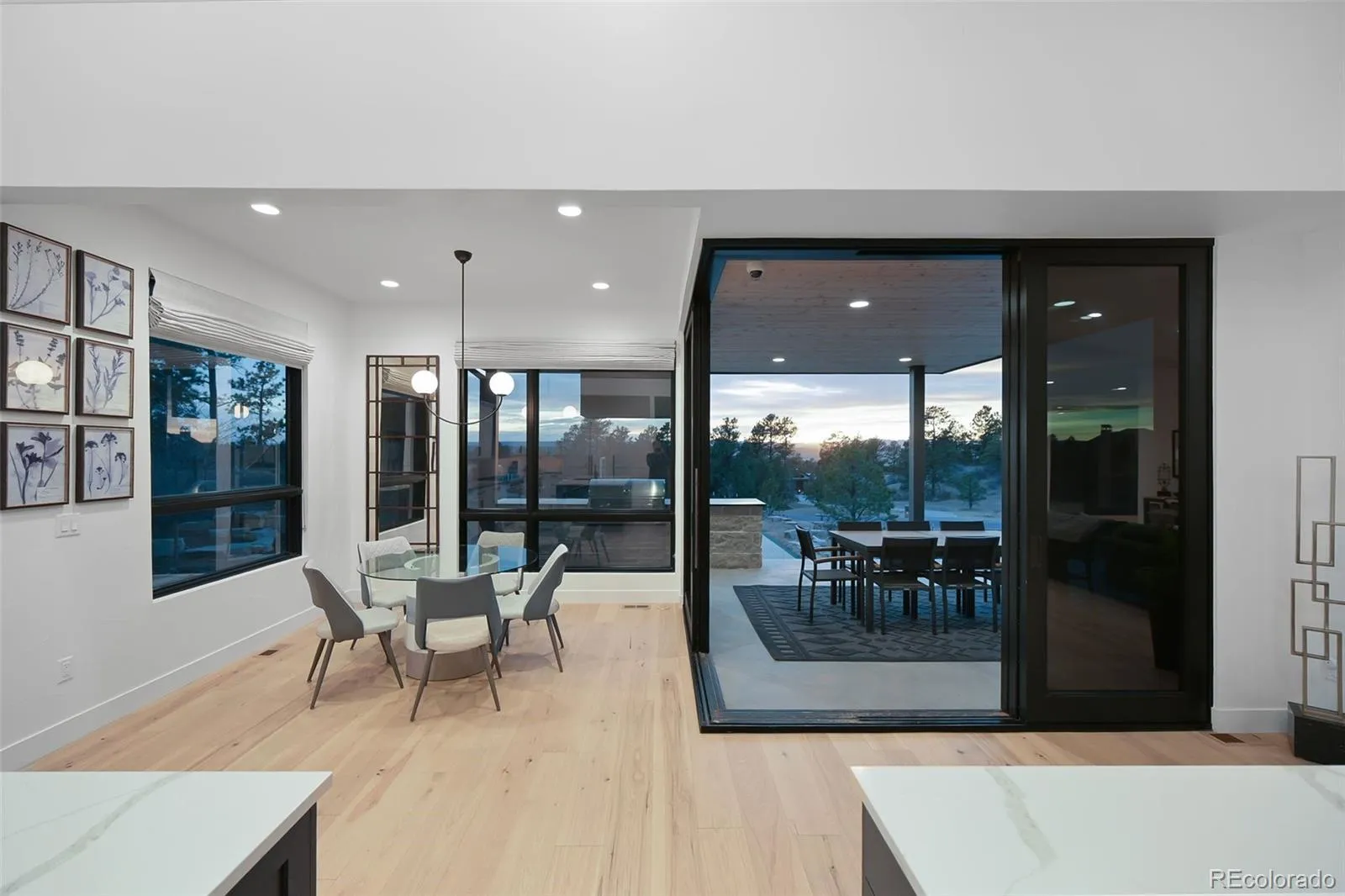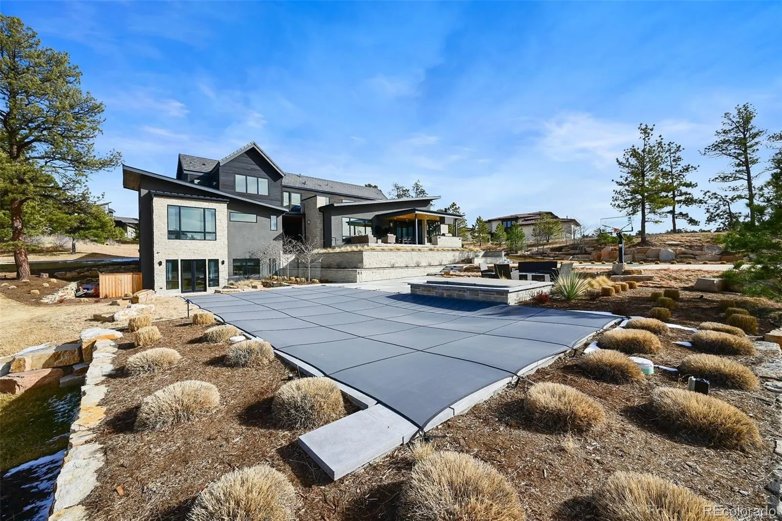 This extraordinary custom residence blends modern architecture, luxury design, and resort-style living on a breathtaking, private setting. Thoughtfully crafted with soaring ceilings, wide-plank hardwood floors, and walls of windows, the home is filled with natural light and showcases stunning mountain and acreage views throughout. The heart of the home is an open-concept living space anchored by a chef’s kitchen with bold soapstone double islands, premium appliances, a cleverly concealed behind seamless cabinet front walk-in pantry, and seamless flow into elegant dining and gathering areas-perfect for both everyday living and grand entertaining. The primary suite is a true retreat, offering a serene bedroom, spa-inspired bath with soaking tub and dual vanities, a gorgeous walk-in closet, and a convenient main-level laundry just steps away. Additional bedrooms are spacious and beautifully appointed, providing comfort and flexibility for family and guests. The lower level is an entertainer’s dream, featuring a full custom bar, expansive recreation space, media area, and a private guest suite with an attached designer bath, coffee bar with beverage refrigerator-ideal for visitors or multi-generational living. Outdoor living rivals that of a luxury resort with a covered patio complete with built-in grill, covered dining area, multiple seating zones, firepit and panoramic views. The grounds are equally impressive, offering a sports court, pool area, hot tub, terraced patios, and tranquil spaces to unwind and take in Colorado’s natural beauty. A gated dog run, stunning landscaping, and expansive 5- car heated garage complete this exceptional property. This is more than a home-it’s a lifestyle of elegance, comfort, and unforgettable living.