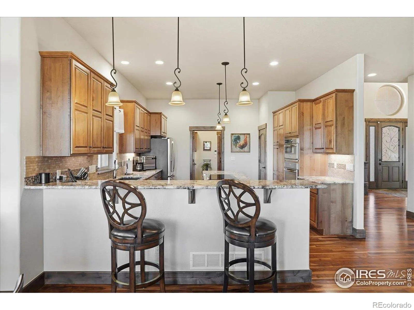 Custom ranch-style home on a spacious corner lot backing to open space and walking trails. Walnut hardwood floors, alder cabinetry, and solid wood doors enhance the main living areas. Windows used are Anderson Windows Fibrex. Finished basement with wet bar offers excellent entertaining space, along with abundant storage throughout. Two gas fireplaces add comfort and warmth year-round. Heated garage with an oversized third bay is ideal for an RV, boat, or workshop. Enjoy privacy, direct access to nature, and ample space for everyday living and gatherings. Additional highlights include dual-zone heating and A/C, two newer water heaters, and a basement concrete safe room.