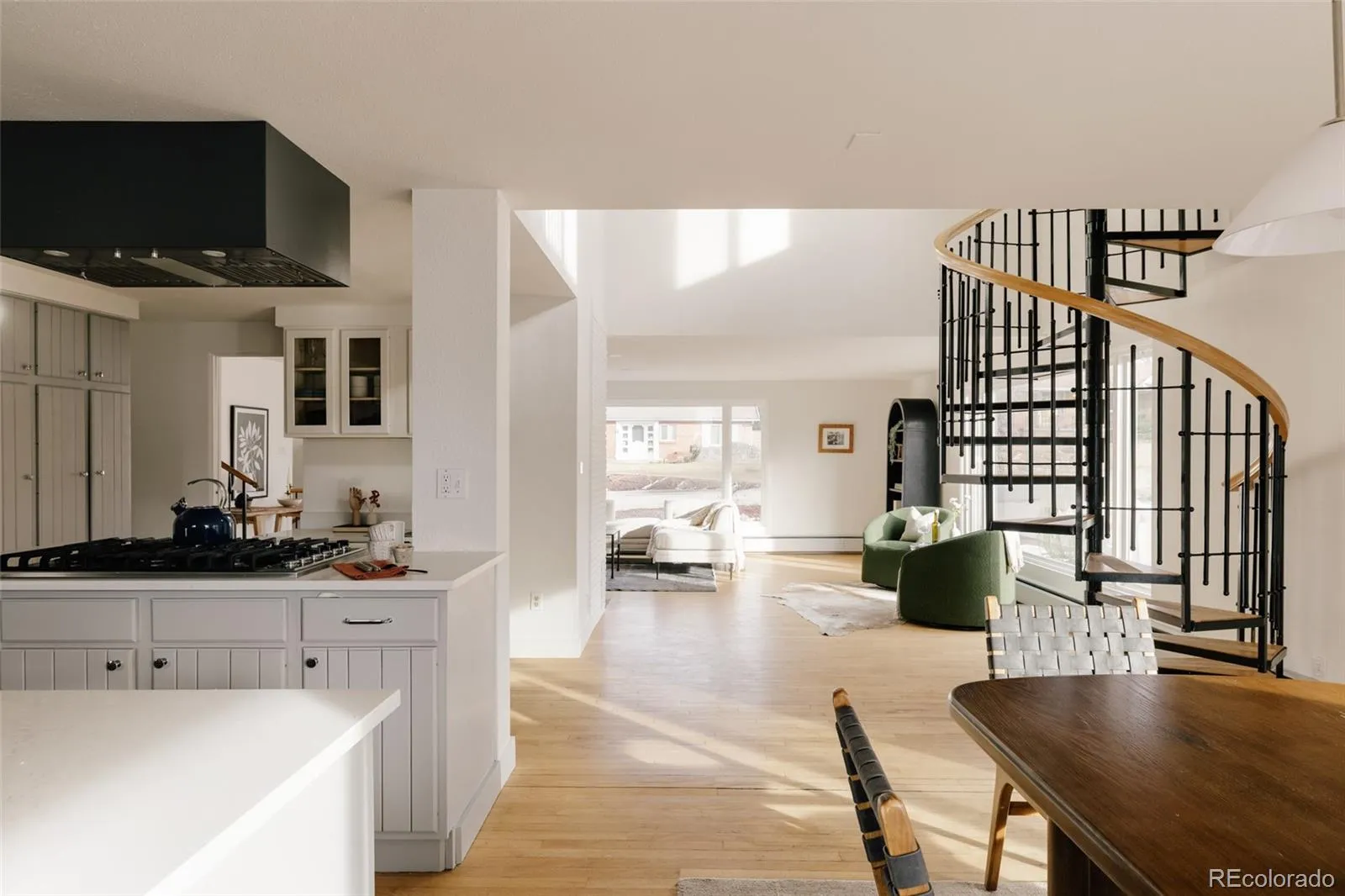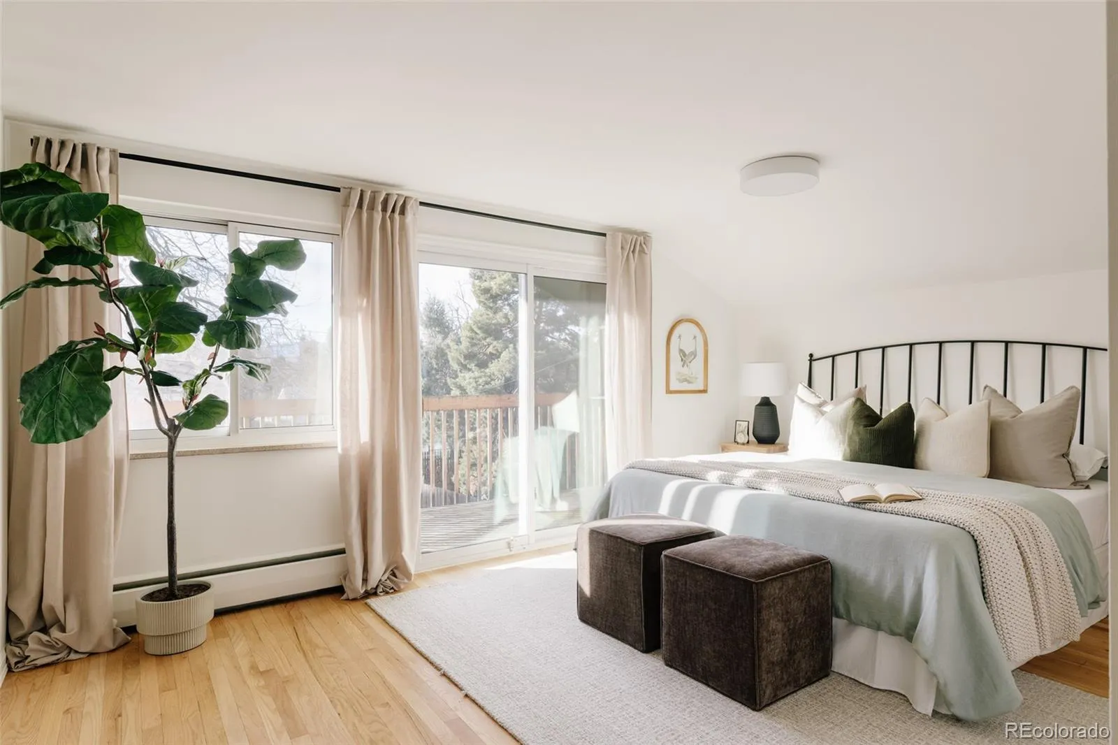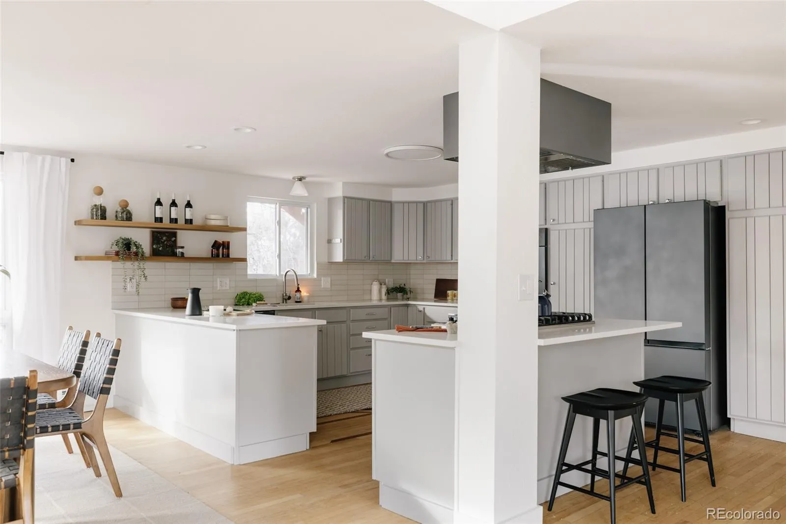 Nestled in Wheat Ridge’s sought-after Bel Aire neighborhood, this beautifully updated home with 3,078sqft above grade offers a rare combination of space, style, and functionality. Expansive picture windows fill the living, kitchen, and dining areas with abundant natural light, creating a bright and welcoming atmosphere throughout. Designed for both everyday living and entertaining, the open chef’s kitchen features Viking appliances, new quartz countertops, and a designer tile backsplash—ideal for hosting memorable gatherings. With three distinct living areas, there is room for everyone to spread out and relax. The main-level living room invites cozy evenings beside the large wood-burning fireplace, while the lower-level walk-out family room is perfectly suited for movie nights, game days, or keeping toys tucked away. A private upper-level loft offers incredible flexibility as a music room, fitness space, or additional office, complete with striking mountain views. Working from home is effortless in the private lower-level office overlooking mature landscaping. The upper level includes 4 comfortable bedrooms and 2 well-appointed baths, highlighted by the primary suite with a newly updated double vanity. Outdoor living is equally inviting, with a thoughtfully xeriscaped front sitting area shaded by old-growth trees and a lush, private backyard—ideal for play, pets, or relaxed Colorado evenings. The oversized two-car garage accommodates vehicles and gear with ease, while the garage loft offers exciting potential for a workshop, gym, or creative retreat. OWNED solar panels keep electric costs remarkably low. The location is hard to beat, with close proximity to Crown Hill Nature Preserve’s trails, as well as local shops and dining in downtown Wheat Ridge. Convenient access to I-70 places downtown Denver roughly 15 minutes away and simplifies trips to the mountains or DIA. This is truly a one-of-a-kind home in an incredible location close to everything. Welcome home.