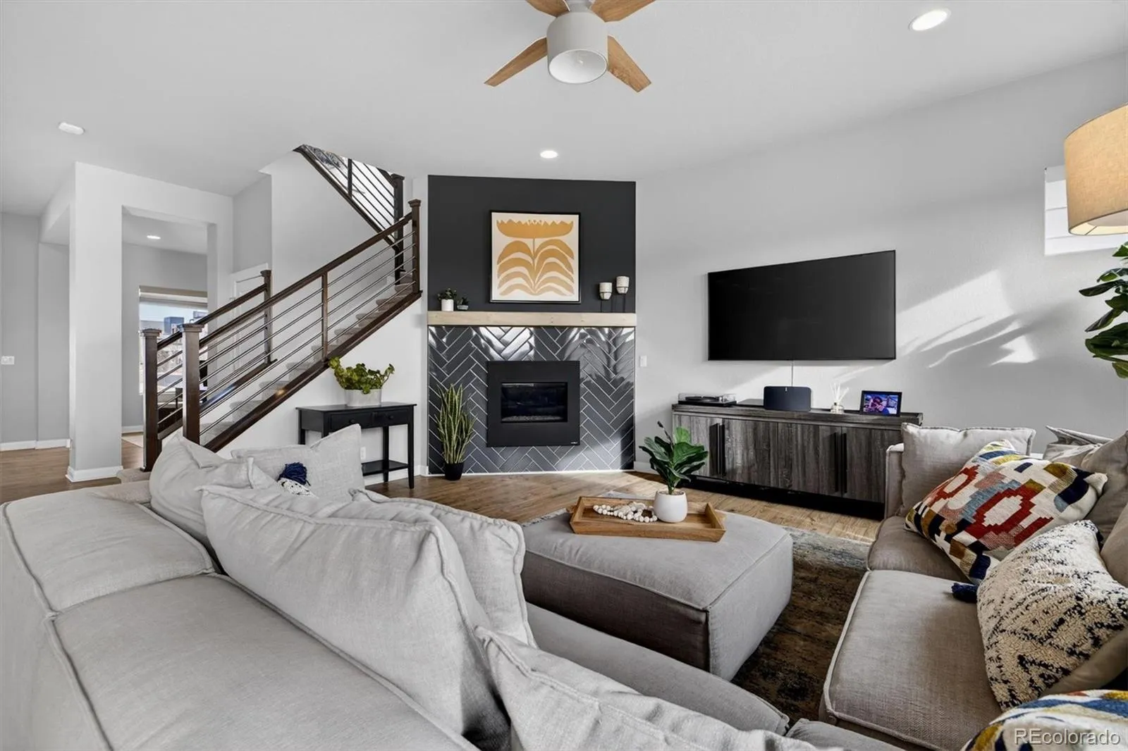 This exceptional David Weekley Energy Star residence offers elevated living on an oversized corner lot just minutes from the heart of Denver! The sought-after Topaz model showcases thoughtful architecture and contemporary finishes throughout, plus enjoy reduced utility bills with OWNED Solar Panels (no additional payments)! Designed for effortless entertaining, the open-concept main level is anchored by a chef’s kitchen featuring a generous quartz island, stainless steel appliances, gas range, walk-in pantry, custom lighting, & a dedicated wine/coffee bar. Expansive windows and sliding glass doors lead seamlessly to a 15’ x 13’ covered deck, with panoramic views stretching from Downtown Denver to the Front Range, perfect for sunset dinners. Durable luxury plank vinyl flooring flows through the main living areas, while the living and dining spaces remain comfortably connected, creating a natural hub for everyday life. // Upstairs, the primary suite is a serene retreat with a spa-inspired bath & oversized walk-in closet. A sunlit loft thoughtfully separates the primary bedroom from two additional bedrooms, complemented by an upstairs laundry room with built-in storage for everyday ease. The finished walk-out basement continues the home’s light-filled, spacious feel with high ceilings, abundant windows, a large recreation area, & an additional bedroom and bath: ideal for guests, a home gym, or media space. Outside, the backyard backs to a greenbelt and the Clear Creek Bike Trail, while the home fronts to a pocket park, offering ample space to play. // Located in the vibrant Midtown community, residents enjoy access to Trailside K-8 School, a Montessori preschool, community center, garden, Bruz Beers brewery, Early Bird cafe, multiple dog parks & playgrounds, bike trails, & RTD Light Rail access. A new 20+ acre park is just west of the neighborhood, and Trader Joe’s & Downtown Denver are only minutes away. *LENDER INCENTIVES AVAILABLE