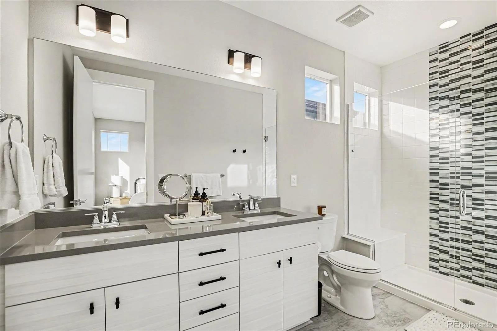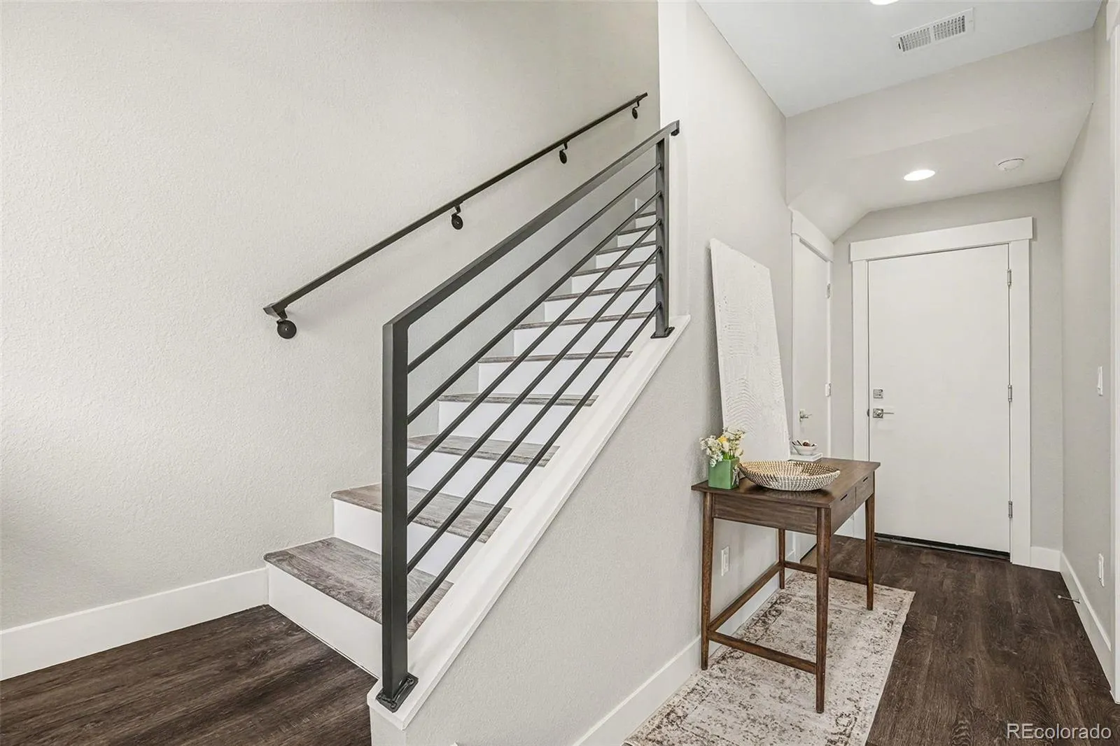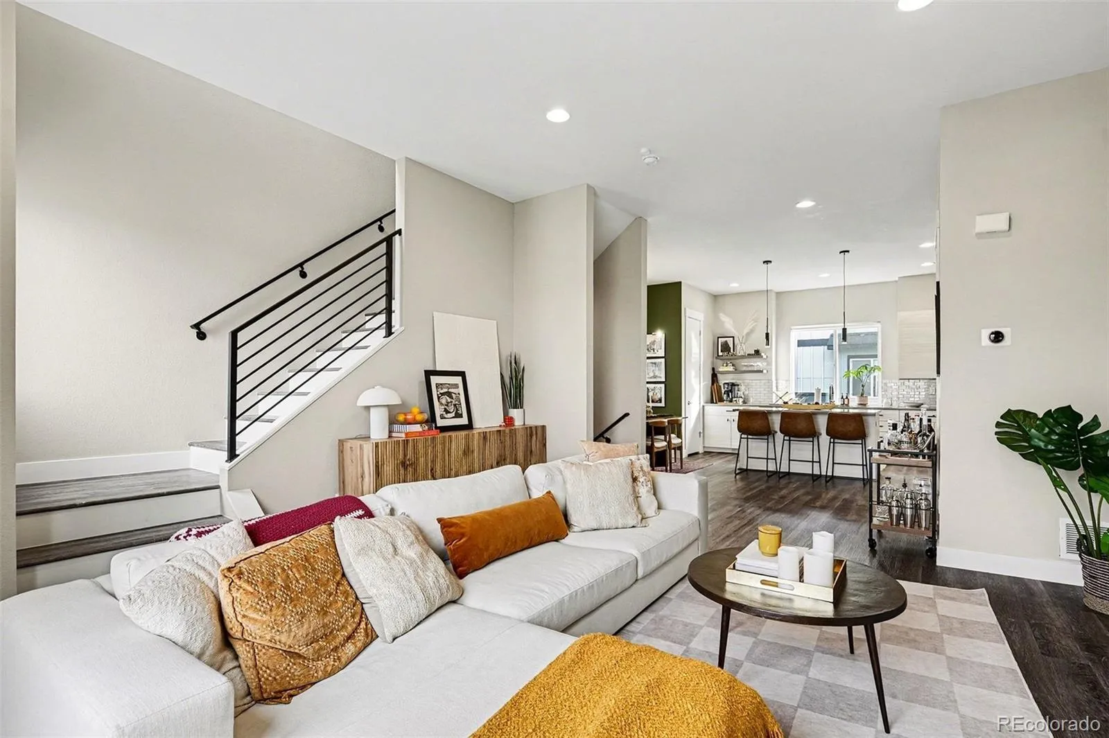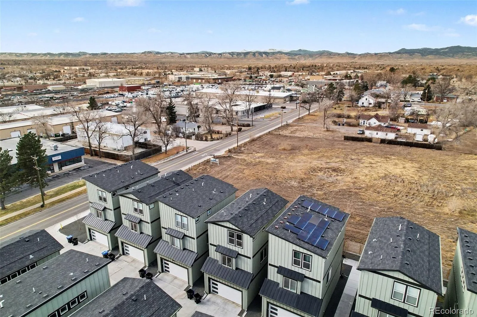 Still showing brand new, this modern 3-story home built in 2023 offers a thoughtfully designed layout, contemporary finishes, and an unbeatable Arvada location with a low HOA. The main level features a versatile office or workout room with a conveniently located bathroom, ideal for today’s work-from-home lifestyle, along with access to the attached 2-car garage. The upper level is open, bright, and warm, highlighted by a spacious living area perfect for entertaining or unwinding by the fireplace. Just off the living room, a private balcony provides mountain views and a seamless indoor-outdoor experience perfect for enjoying your morning coffee or an evening cocktail. The kitchen is both stylish and functional, featuring upgraded cabinetry, stone countertops, stainless steel appliances,a modern backsplash, kitchen island, and pendent lighting. The dedicated dining area sits just off the kitchen, making the space ideal for everyday living as well as hosting guests. Upstairs, you’ll find two well-appointed bedrooms, each with its own en suite bathroom. One bedroom works beautifully as a guest suite or separate home office, complete with a walk-in closet, full bath, and mountain views. The primary suite is generously sized and features an expansive walk-in closet along with a well-designed en suite bath offering double vanities and a modern walk-in shower. Ideally located near Olde Town Arvada, the Arvada Gold Strike Light Rail Station, Homestead Park, I-70 for quick access to the high country, and the newly updated Clear Creek Valley Park. This home offers direct access to the Clear Creek Trail, delivering modern living with exceptional access to dining, shopping, trails, parks, and transportation.