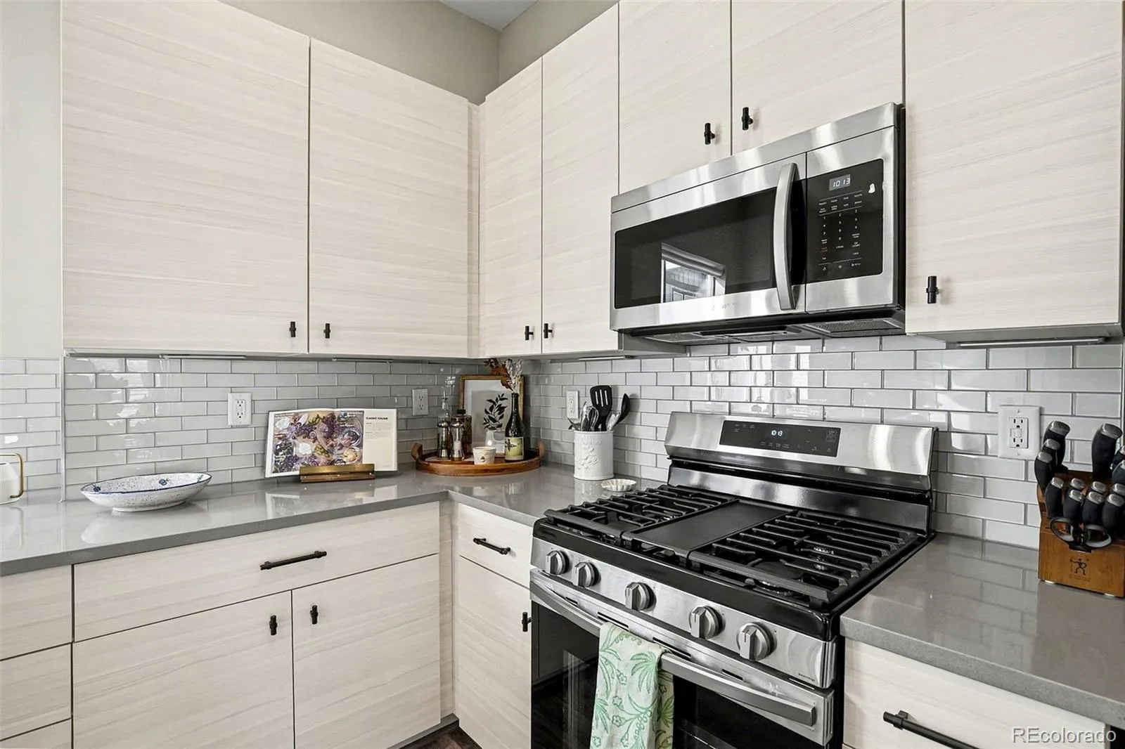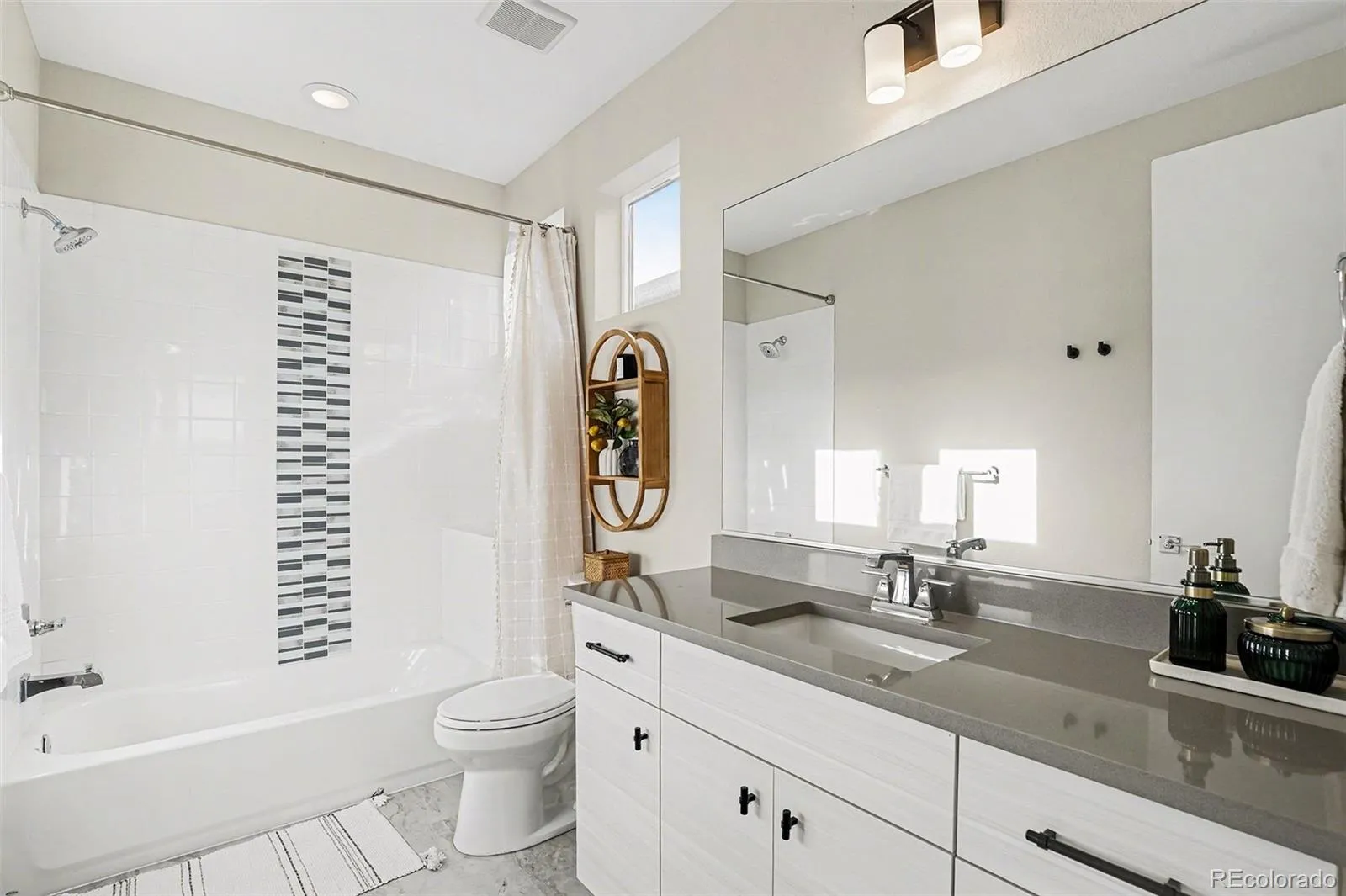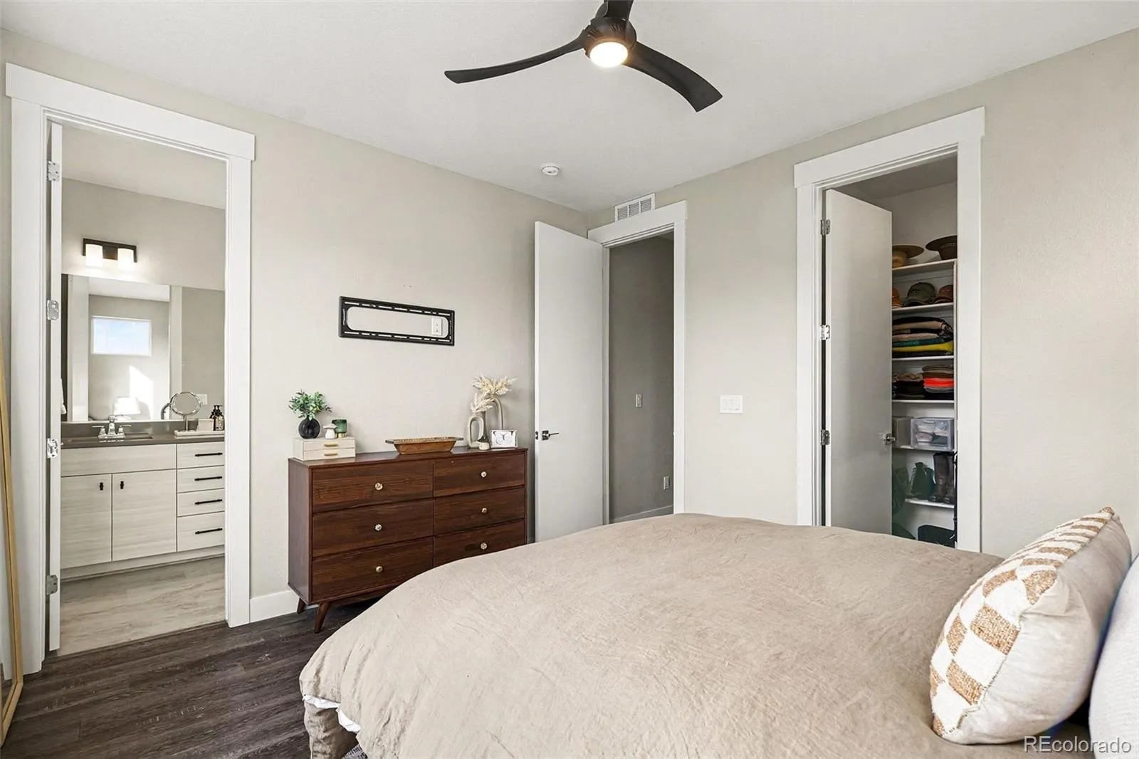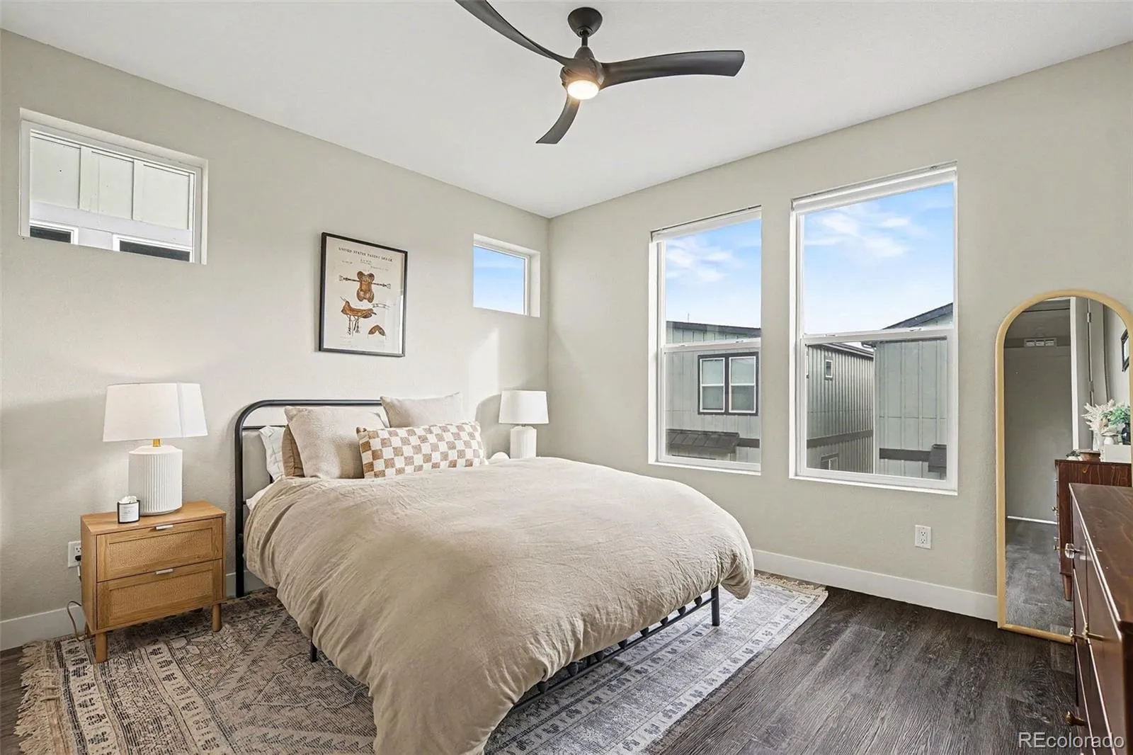 Still showing brand new, this modern 3-story home built in 2023 offers a thoughtfully designed layout, contemporary finishes, and an unbeatable Arvada location with a low HOA. The main level features a versatile office or workout room with a conveniently located bathroom, ideal for today’s work-from-home lifestyle, along with access to the attached 2-car garage. The upper level is open, bright, and warm, highlighted by a spacious living area perfect for entertaining or unwinding by the fireplace. Just off the living room, a private balcony provides mountain views and a seamless indoor-outdoor experience perfect for enjoying your morning coffee or an evening cocktail. The kitchen is both stylish and functional, featuring upgraded cabinetry, stone countertops, stainless steel appliances,a modern backsplash, kitchen island, and pendent lighting. The dedicated dining area sits just off the kitchen, making the space ideal for everyday living as well as hosting guests. Upstairs, you’ll find two well-appointed bedrooms, each with its own en suite bathroom. One bedroom works beautifully as a guest suite or separate home office, complete with a walk-in closet, full bath, and mountain views. The primary suite is generously sized and features an expansive walk-in closet along with a well-designed en suite bath offering double vanities and a modern walk-in shower. Ideally located near Olde Town Arvada, the Arvada Gold Strike Light Rail Station, Homestead Park, I-70 for quick access to the high country, and the newly updated Clear Creek Valley Park. This home offers direct access to the Clear Creek Trail, delivering modern living with exceptional access to dining, shopping, trails, parks, and transportation.