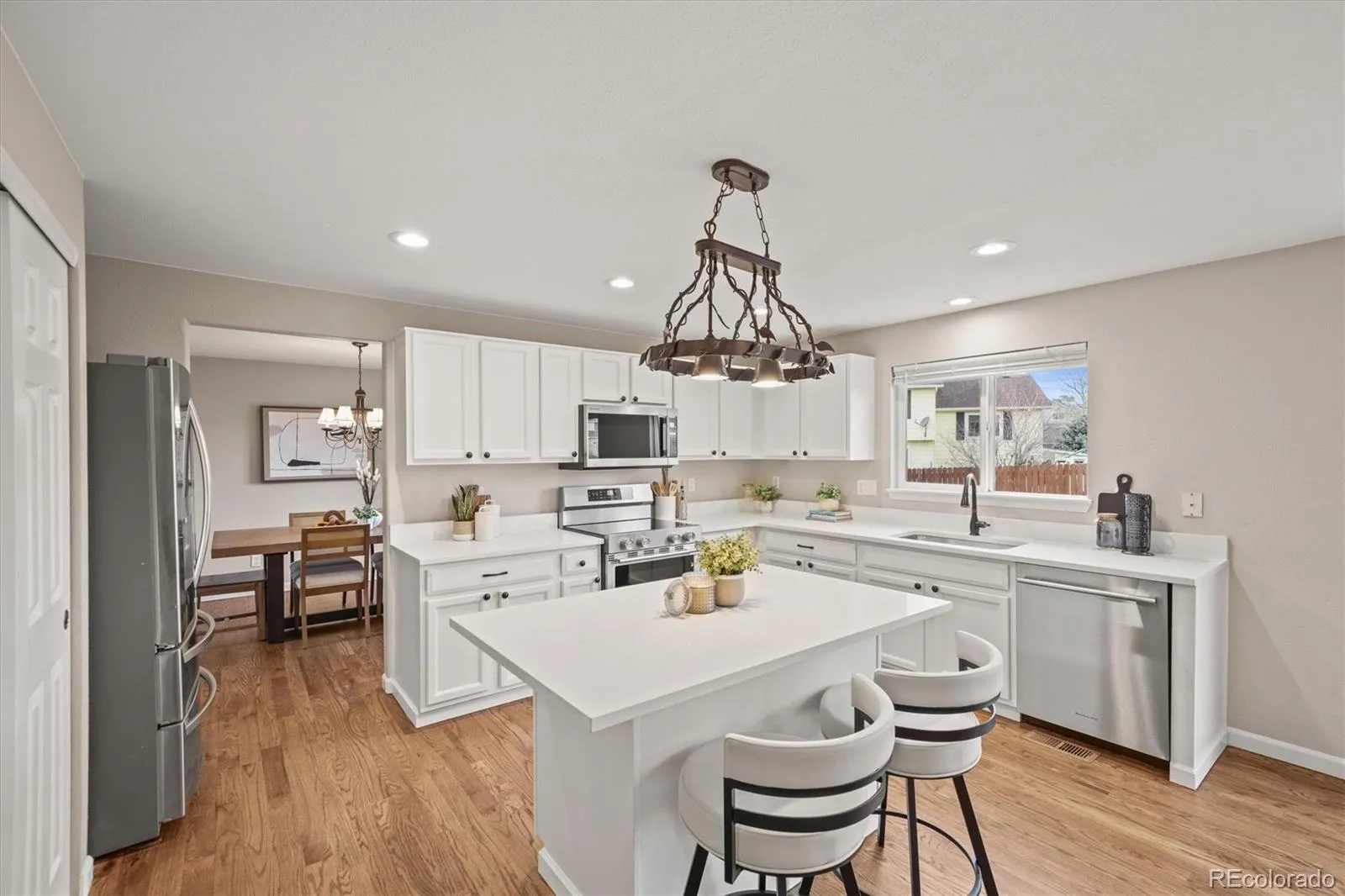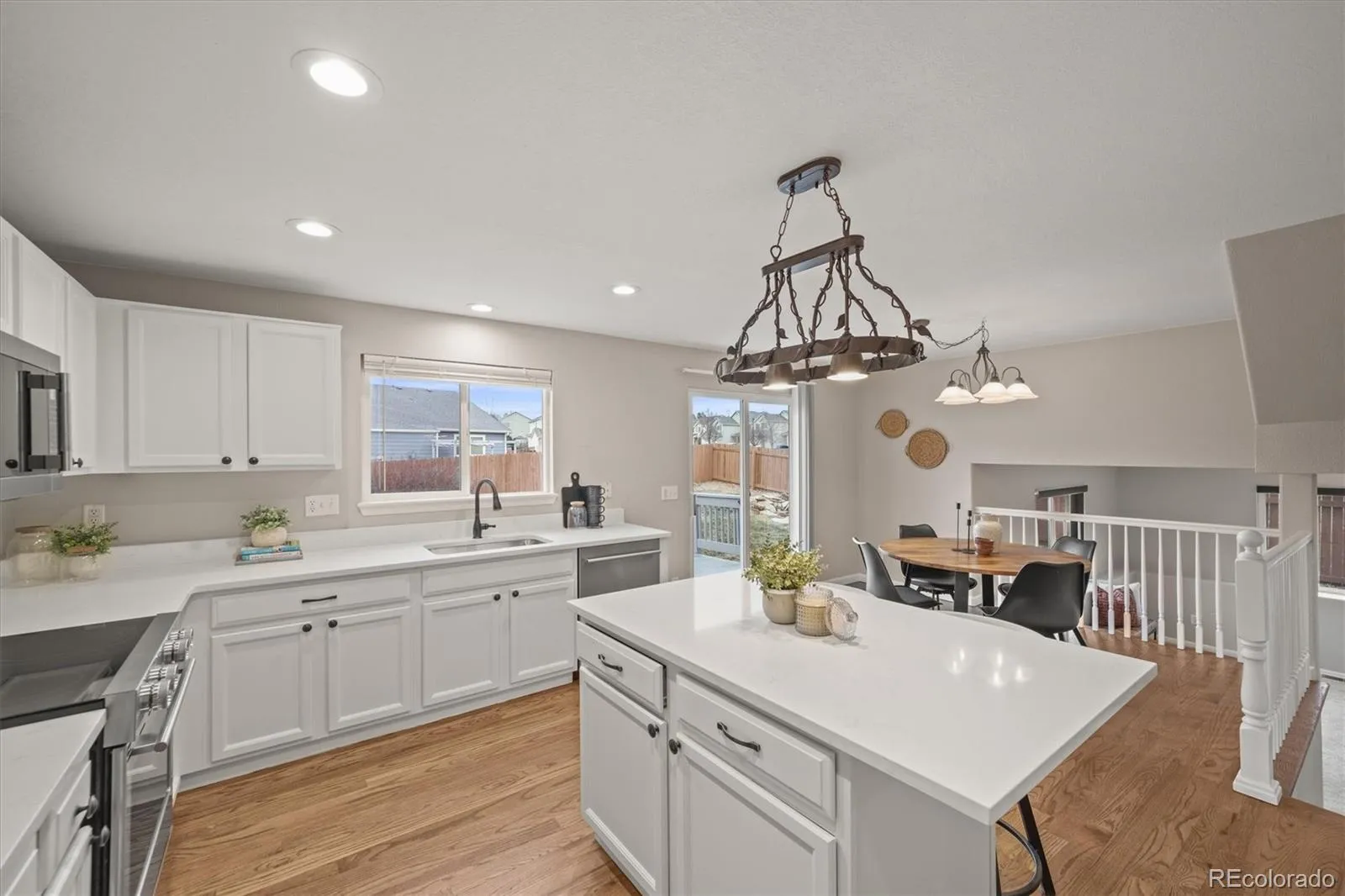 This beautifully updated 5 Bedroom, 4 Bathroom home is located in Canterberry Crossings, a sought-after master-planned community near Black Bear Golf Club, a premier Parker golf course, plus exceptional neighborhood amenities including a pool, tennis and trails. This gorgeous home is situated on a serene corner lot that sides to an open area for enhanced privacy. The interior has been thoughtfully updated throughout, showcasing a newly remodeled kitchen with breakfast nook and new stainless steel appliances, quartz countertops, and a center island ideal for both everyday living and entertaining. The spacious primary suite is a true retreat, complete with a luxurious five-piece bath. Cozy family room with gas fireplace. Finished basement featuring a Rec/Media Room, plus a bedroom and a ¾ bath. Recent improvements include new interior and exterior paint, new carpet, refinished oak hardwood floors, updated light fixtures, a new garage door and smart opener, and a new water heater. The home also benefits from newer roof shingles, providing added peace of mind. With its extensive upgrades, functional layout, and prime location within the community, this residence offers a turnkey opportunity for refined and comfortable living. This is truly the dream home you have been looking for!
