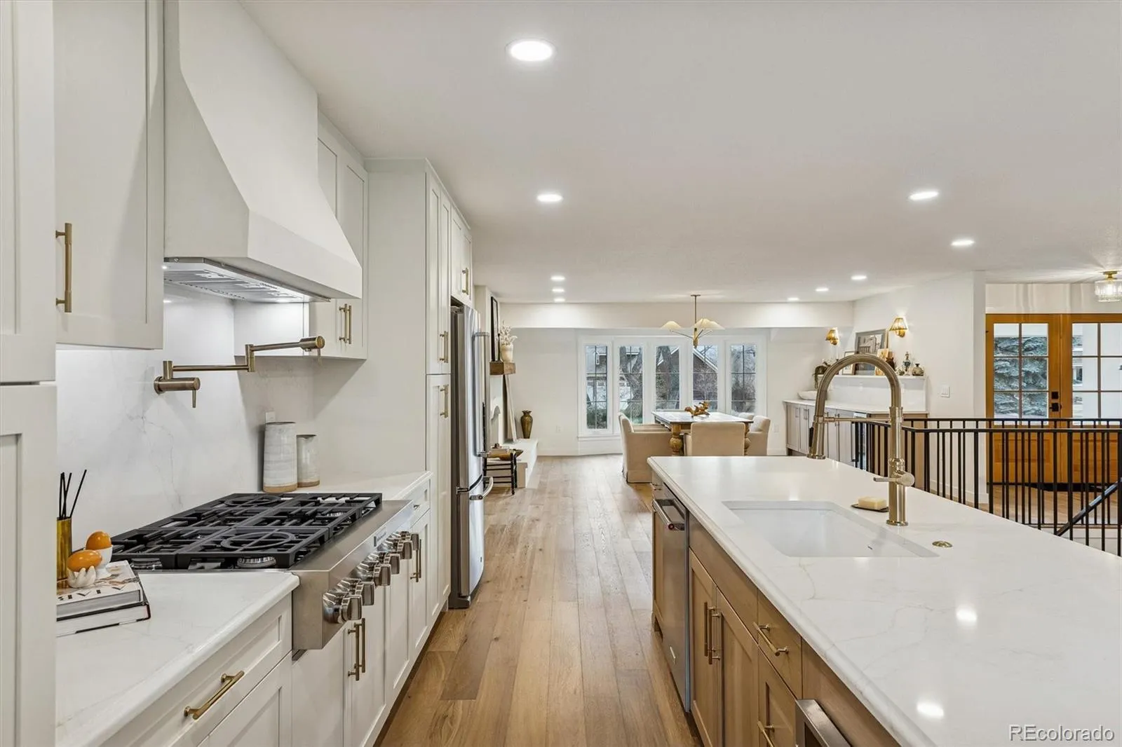 Wide plank engineered hardwoods, a fully opened up living space, and curated designer finishes set the tone throughout. The open concept main level is filled with natural light and designed for both everyday living and elevated entertaining. At the heart of the home, the showpiece kitchen features custom solid oak cabinetry, statement hood, premium appliances, cabinet mounted double ovens, and an oversized island with quartz counters. A custom buffet and wine bar anchor the dining space, while oversized sliding glass doors connect seamlessly to a private stamped concrete patio and serene backyard perfectly blending indoor & outdoor living.
