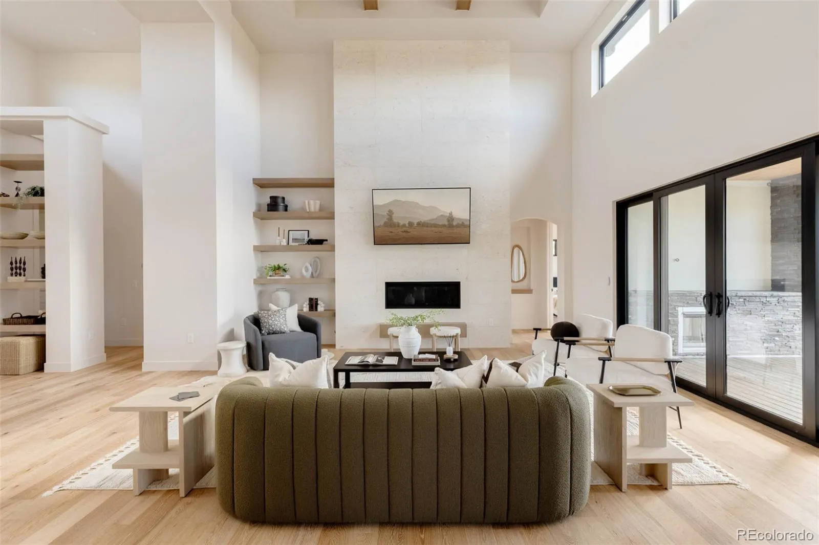 The powder bath is a showpiece with a wood-slat tiled wall, floating vanity, and exotic counters. The great room impresses with soaring two-story ceilings, wood beam accents, and a dramatic fireplace with built-ins and lighting. Sliders open to a covered patio with a built-in grill, perfect for gatherings. The primary suite is a private retreat with wood-beam details, a balcony with sweeping views, heated flooring, and a spa-inspired bath offering double vanities, a walk-in shower, European soaking tub, and dual custom walk-in closets.