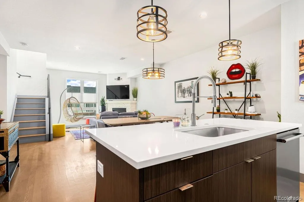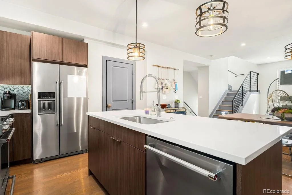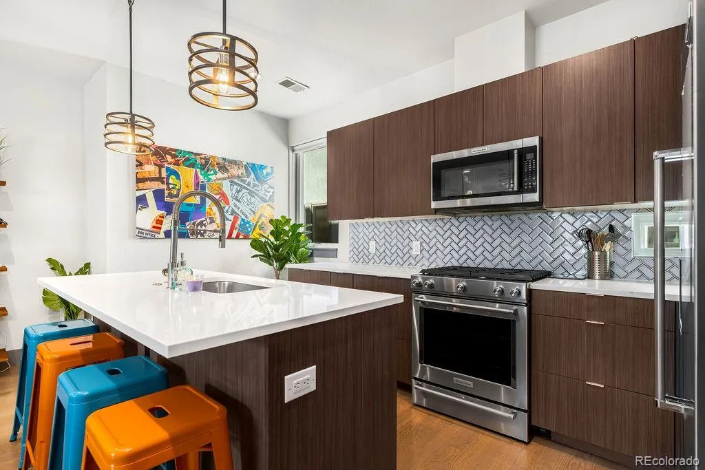 Urban modern living in Jefferson Park with no HOA. This tri-level townhome offers 2 bedrooms, 2.5 bathrooms, and 1,587 sqft of stylish, move-in-ready space, plus an attached 2-car garage and a huge rooftop patio with downtown Denver skyline views. The open-concept main level features wide-plank white oak hardwood floors, a gas fireplace, quartz countertops, stainless steel appliances, and a large kitchen island built for everyday living and easy entertaining. Upstairs, the spacious primary suite includes an en-suite bath with a twin-sink vanity and a large walk-in shower. Fresh paint and new carpet add to the turnkey feel. The rooftop patio is hot tub ready and includes a gas connection for a grill, creating an exceptional outdoor space for relaxing, dining, or entertaining against the city skyline. Located in the heart of Jefferson Park with a Walk Score of 89, you are close to neighborhood favorites, downtown, LoHi, Safeway, and quick access to I-25 and I-70 for the mountains. A rare chance to own a larger, modern townhome with skyline views, no HOA, and strong walk score in one of Denver’s most desirable neighborhoods.