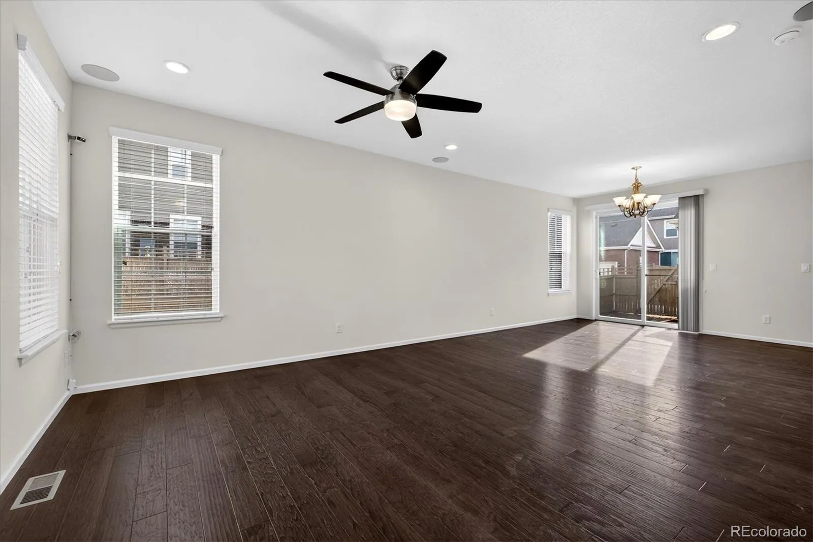 Welcome home to 14801 E Poundstone Dr, a beautifully maintained corner-unit paired home in the desirable Pioneer Hills community of Aurora. Surrounded by open green space on three sides, this home offers a rare sense of privacy and calm. The covered front porch faces a landscaped green area and private walkway, accented by a decorative retaining wall that adds charm and separation from neighboring communities.