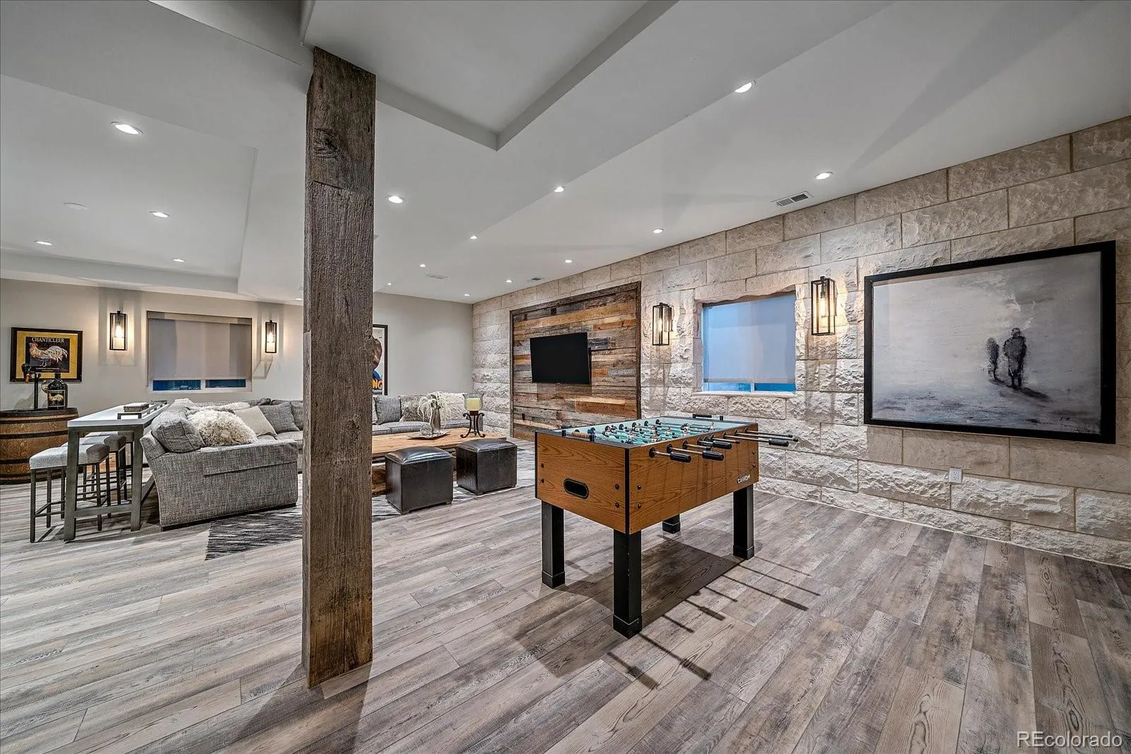 Nestled inside the gates of Cherry Creek Country Club, this Tudor-style home delivers refined craftsmanship and modern comfort in one of Denver’s premier golf course communities. Wide-plank hardwoods, quartzite surfaces, custom lighting, curated hardware and layered textures set an elevated tone throughout. The open great room features a reclaimed wood tongue-and-groove vaulted ceiling, exposed beams, an industrial barn door accent and a dramatic floor-to-ceiling stone fireplace, all connecting to a heated, pergola-covered patio surrounded by lush landscaping for privacy. The gourmet kitchen is a true focal point with Wolf and Sub-Zero appliances, a 6-burner range, large quartzite island with seating, built-in wine fridge, buffet, walk-in pantry, custom tile backsplash and breakfast nook with built-in bench. The main-level primary suite offers vaulted ceilings, a 5-piece bath with jetted tub and a walk-in closet with Bosch washer and dryer. French doors open to a private study with custom wood built-ins and plantation shutters.