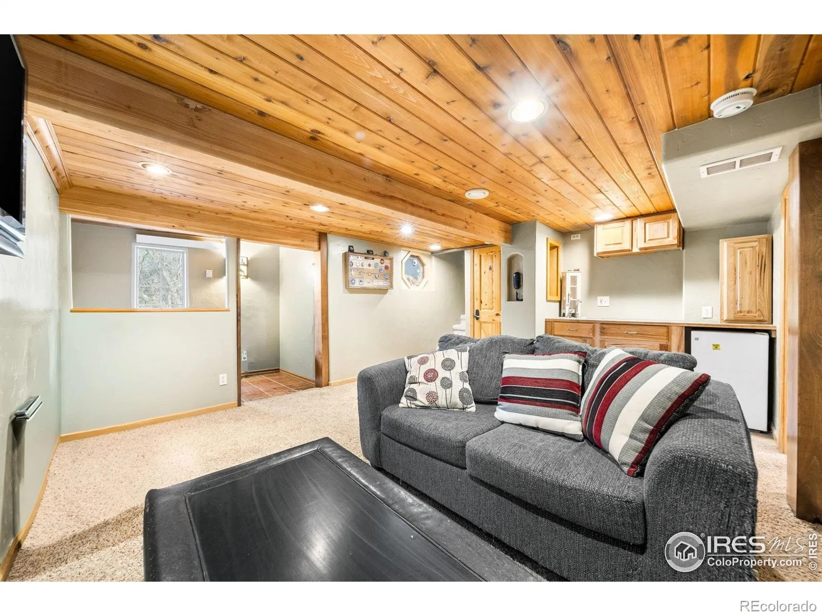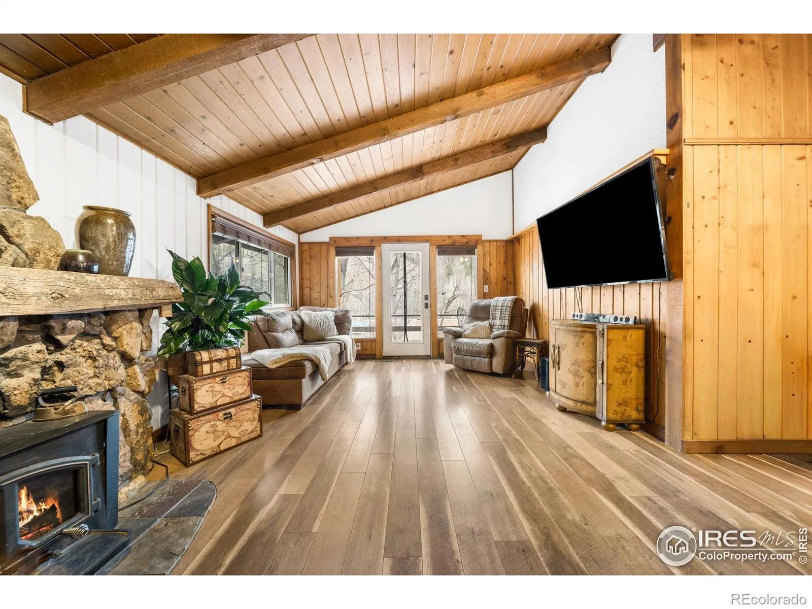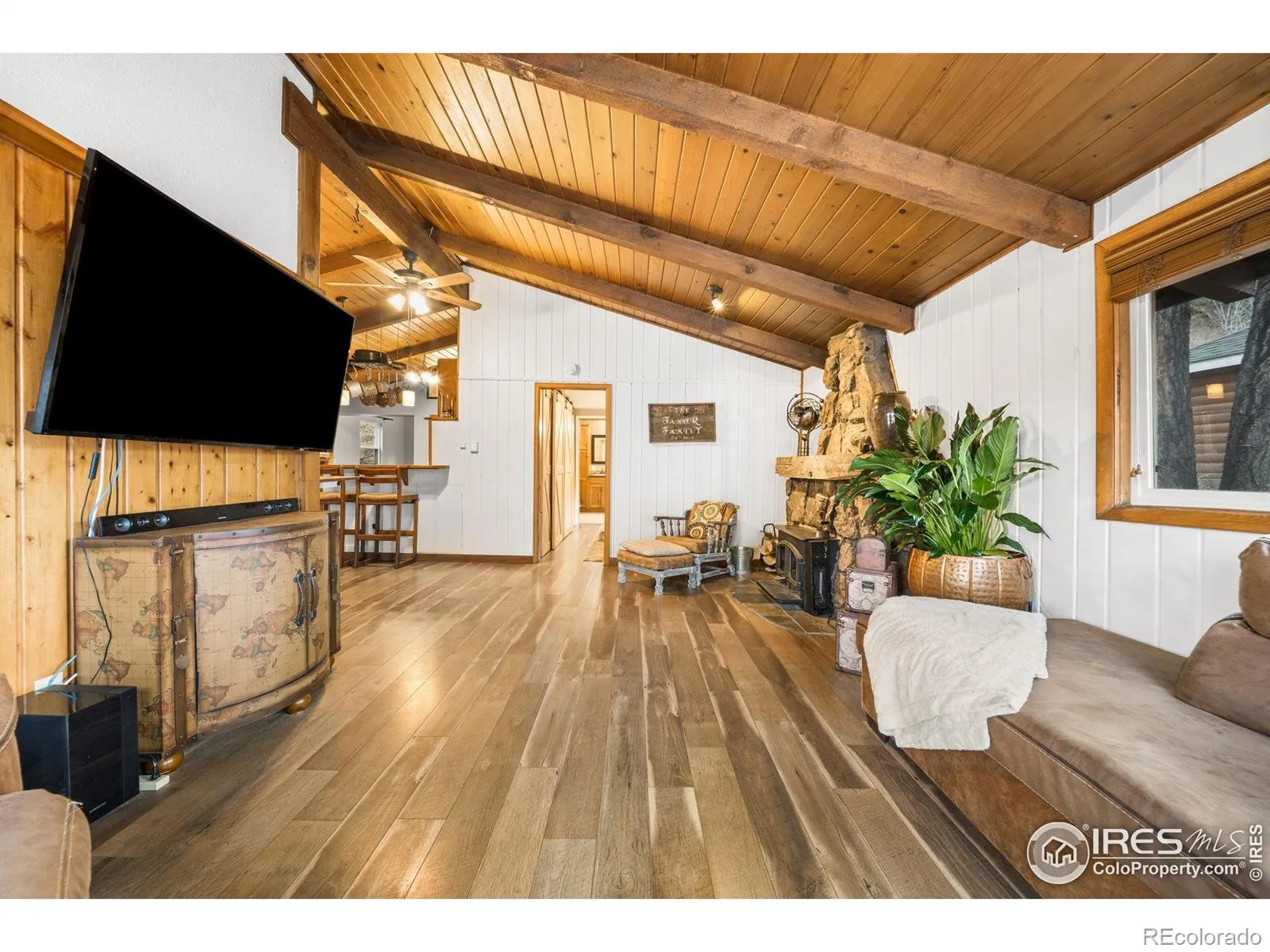 This inviting log-style mountain home is perfectly positioned at the end of a quiet cul-de-sac, with a private driveway leading up to a serene retreat nestled along the side of the Rocky Mountains and directly across from the iconic Big Thompson River. Surrounded by natural beauty, the home offers mountain and canyon views from practically every room, while numerous windows fill the interior with natural light and ever-changing scenery. The open kitchen is highlighted by vaulted ceilings with wood beam accents and stainless steel appliances, including a stainless gas range and oven. The kitchen flows into an incredible living room where a wood-burning fireplace creates a warm, classic mountain atmosphere. This space opens to a wraparound deck and porch delivering nearly 180-degree views of the Rocky Mountains and Big Thompson Canyon-ideal for relaxing, entertaining, or simply enjoying the peaceful setting. A formal dining room overlooks the outdoor patio area, enhancing the connection between indoor and outdoor living. The primary suite features a 5-piece bathroom with a walk-in shower and soaking tub. The walkout basement continues the home’s cohesive design with aesthetic wood beams in the lower level and includes a separate exterior entrance, offering excellent potential for multi-generational living, guests, or a private retreat. Outdoor amenities include a covered pergola with power, a dedicated chiminea gathering area, and a turf space complemented by natural vines and greenery that blend seamlessly into the mountainous surroundings. Practical features include half-log siding, storage beneath the front deck, a custom-built carport, and a detached, heated garage or shop measuring approximately 24×32 ft, oversized door, and roughly 700+ square feet of heated space. The property is supported by a well with two 175-gallon cisterns, a water filtration system. Just 15 minutes from town, this home offers privacy, functionality, and authentic Colorado mountain living.
