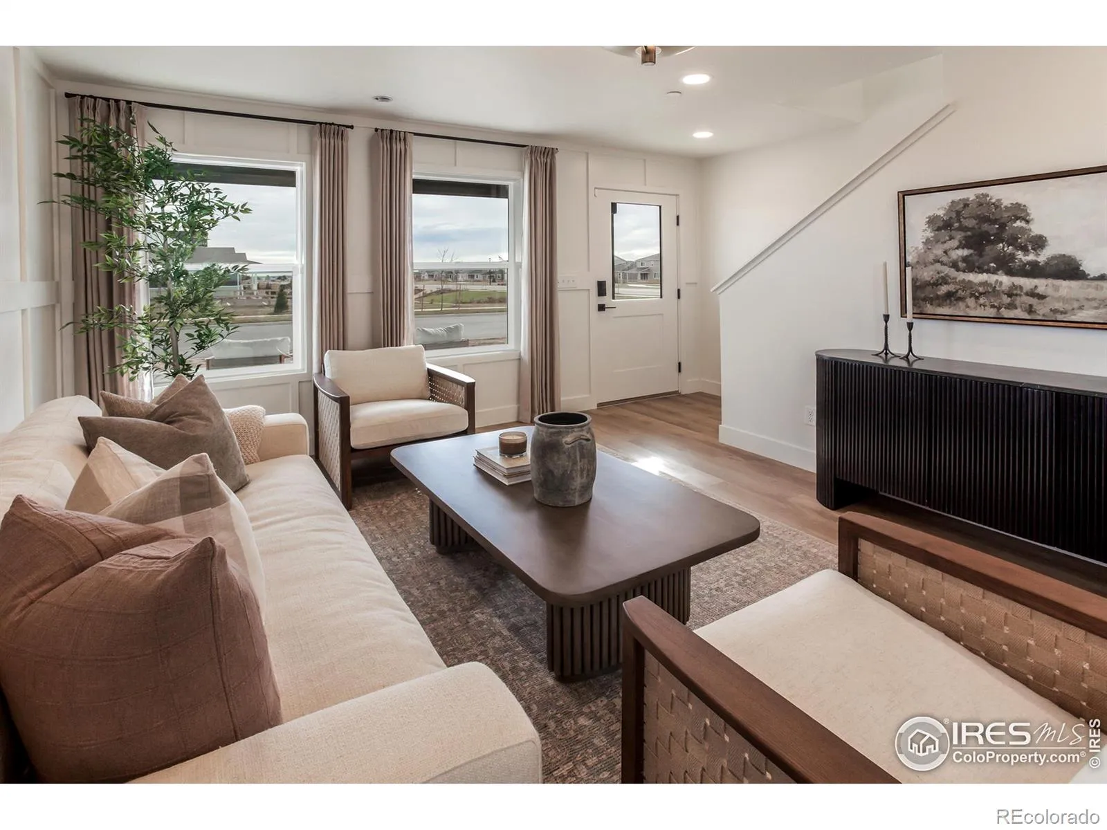Model home for sale as a lease-back to the builder while needed. Ask about lease terms. Farmhouse elevation Magnolia plan by Hartford Homes in Prairie Song in Windsor. New construction cottage home. Open floor plan, two story. Kitchen w/ island. Powder bath on main level. Biscotti stained maple cabinetry. Blanco maple quartz countertops. Vinyl plank flooring throughout main level and carpet in bedrooms. S.s. dishwasher, fridge, microwave, range. Second level has 2 bedrooms and laundry w/ Washer & dryer included. Central a/c. 2 car garage. Garage door opener and keypad. Passive radon system. Fenced yard w/ landscaping included (artificial turf in backyard). Future community plans for a pool, parks and trails. There is a $200 annual non-potable water fee to be paid to metro district. $125 monthly o & m fee for metro district. model home lease back