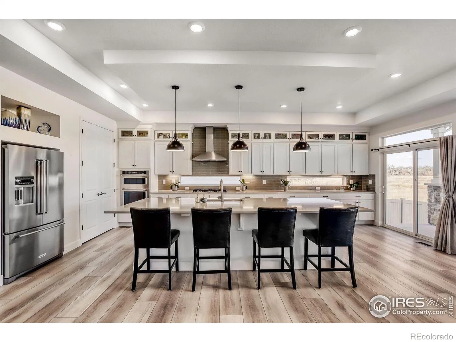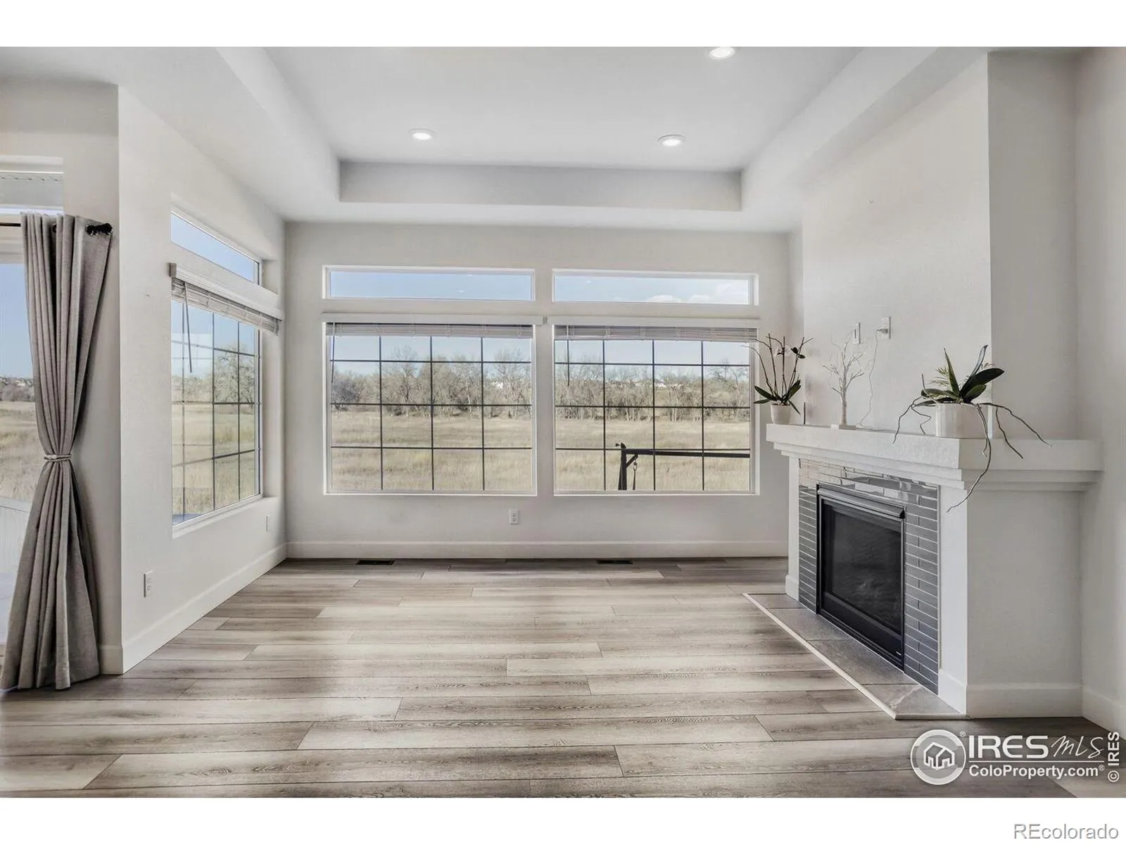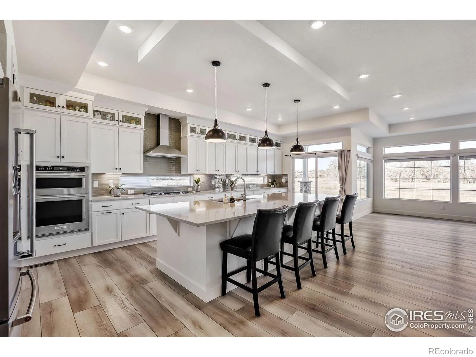 Welcome to this pristine, meticulously maintained 4-bed, 3.5-bath ranch in the heart of Thompson River Ranch – one of Colorado’s most desirable communities. Built in 2023, this home offers modern design, open living, and a layout perfectly suited for both everyday comfort and entertaining. The heart of the home is the gourmet kitchen, featuring a stunning quartz eat-in island, five-burner gas cooktop, SS appliances, walk-in pantry, abundant cabinetry, and full tile backsplash. The kitchen flows effortlessly into the great room with fireplace and dining area, creating an inviting space for gatherings or quiet evenings at home. The main-level primary suite is a private retreat with a spa-style shower, dual vanities, walk-in closet, and direct access to the laundry room. A main-floor study with French doors provides flexible space for a home office or formal dining. The finished basement expands your living options with a spacious family room, two bedrooms, a full bath, activity center, and generous storage. Throughout the home, careful post-build attention to detail ensured minor fit-and-finish items were professionally addressed, resulting in a truly polished, move-in-ready residence. Added comforts include a whole-house humidifier for year-round comfort. Step outside to a fully landscaped and fully irrigated backyard with drip lines, backing to open space with sweeping views down to the river corridor, massive mature trees, and frequent wildlife sightings – a peaceful setting that truly sets this home apart. An oversized 2-car garage offers excellent space for vehicles, gear, and storage. Thompson River Ranch residents enjoy pools, clubhouse, disc golf, parks, trails, and year-round community events, along with easy access to I-25, shopping, and top-rated schools. Just minutes from Loveland’s thriving arts scene, Boyd Lake, and mountain recreation. Ready for your private showing – a rare opportunity to own a truly turn-key home in an exceptional setting.