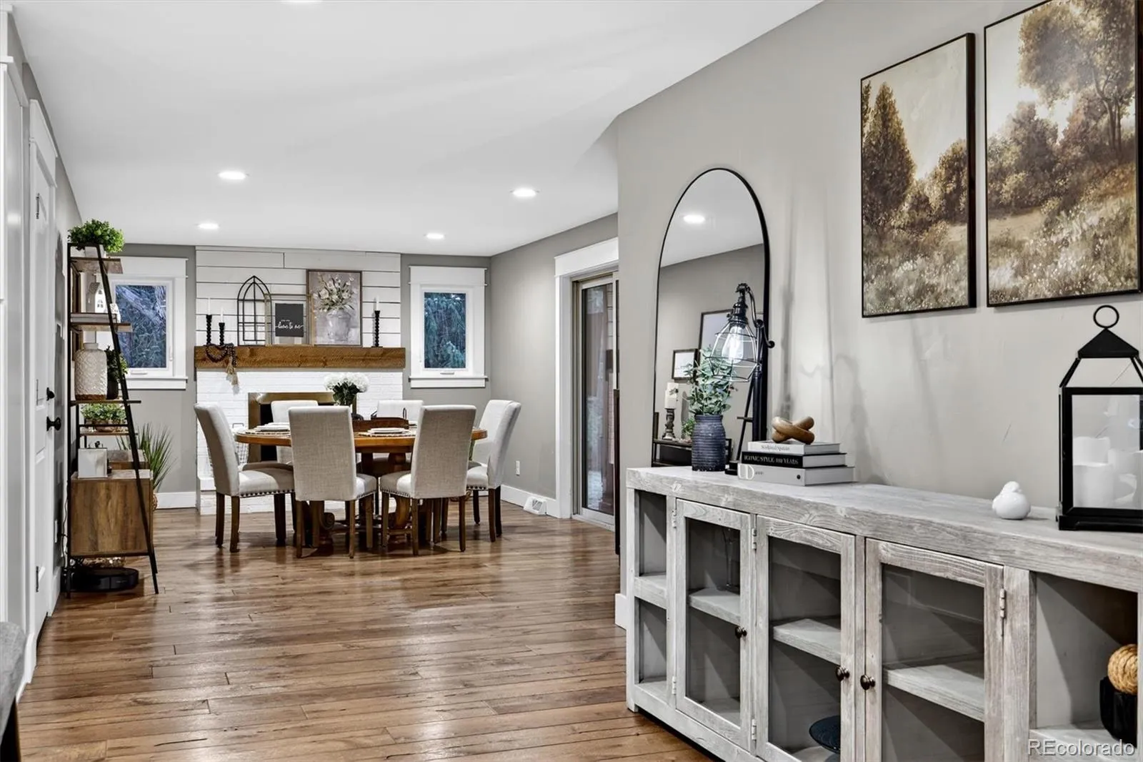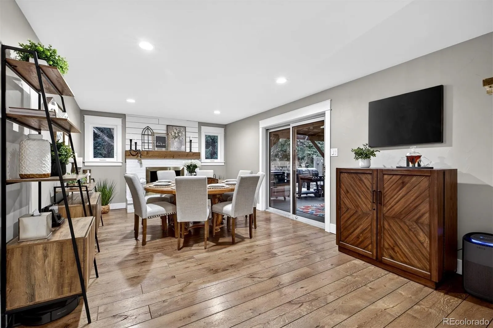 The open-concept main level features 3 bedrooms and 2 bathrooms, newer hardwood floors, new windows, and a newly remodeled high-end kitchen with a large island and newer, top-of-the-line KitchenAid appliances—ideal for both everyday living and entertaining. The fireplace area is currently styled as a dining space, showcasing the home’s flexible layout.