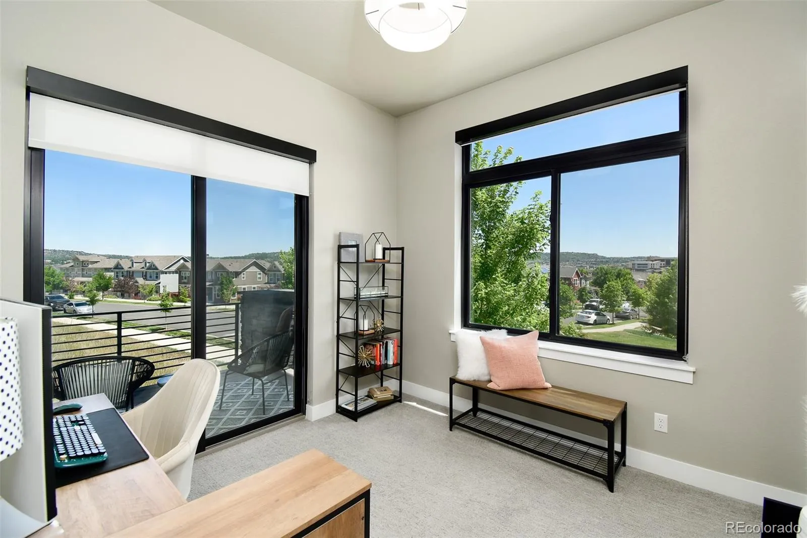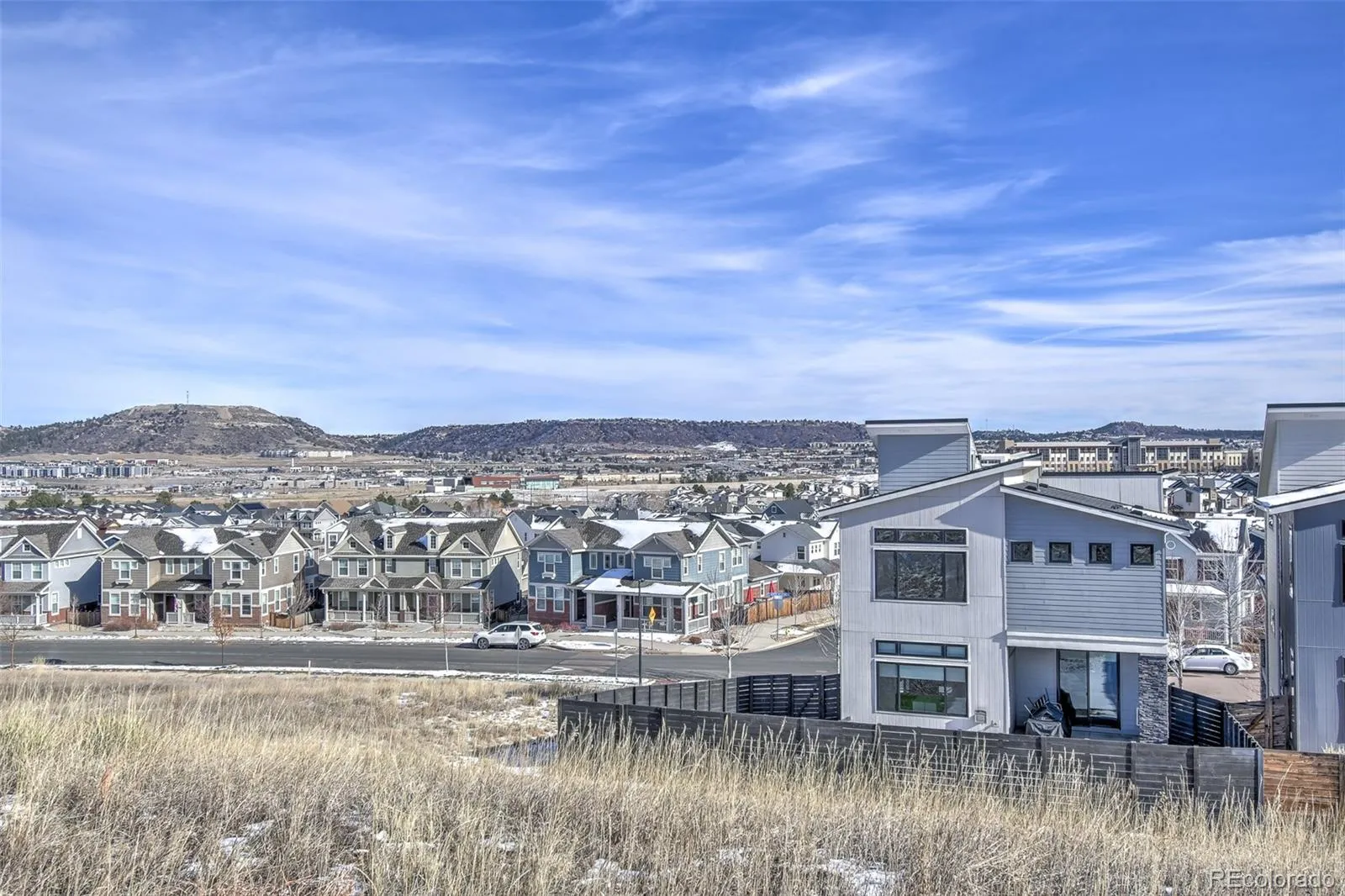 The dream home you have been waiting for is here! Designer luxury touches & adjacent to open space with breathtaking views. Enjoy your own oasis on the roof top deck with hot tub & fire pit. Look to the West for views of the front range Rocky Mountains or to the East for sweeping views of the Castle Rock valley. Surround yourself with high-end modern design. The open concept main level delights with floor-to-ceiling stacked stone linear fireplace. The chef’s dream kitchen includes elegant waterfall countertops on the large island. You’ll love cooking in this kitchen with Bosch gas cooktop & double built-in ovens, stainless-steel hood, coffee bar & a huge walk-in pantry. Kitchen opens to dining area with access to the fantastic covered back patio. The main floor includes a bedroom or office with its own covered balcony & huge walk-in closet. Upscale bathroom with shower will impress your guests. Continue upstairs past the large windows with beautiful views to a fantastic loft with central access to the bedrooms. The primary bedroom boasts a vaulted ceiling, stunning views, ensuite bathroom & a large walk in closet. The bathroom feels like a spa with free standing deep soaking tub, a shower with dual entrances & dual shower heads. Two additional bedrooms are located past the loft area that share an upscale full bathroom. Conveniently located laundry on this level with easy access from all bedrooms. Continue upstairs to the large & awe-inspiring rooftop deck with hot tub & gas fire pit. Additional guest suite bedroom with large walk in closet with private bathroom & multiple storage areas on the lower level. So many upscale features like custom motorized blinds, dual zone HVAC System, Anderson windows & private outdoor space on every level of the home. Great location in the Meadows near I-25 & Santa Fe, outlet mall, with plentiful dining options. Enjoy access to multiple trails off the serene hillside open space backing to the home.