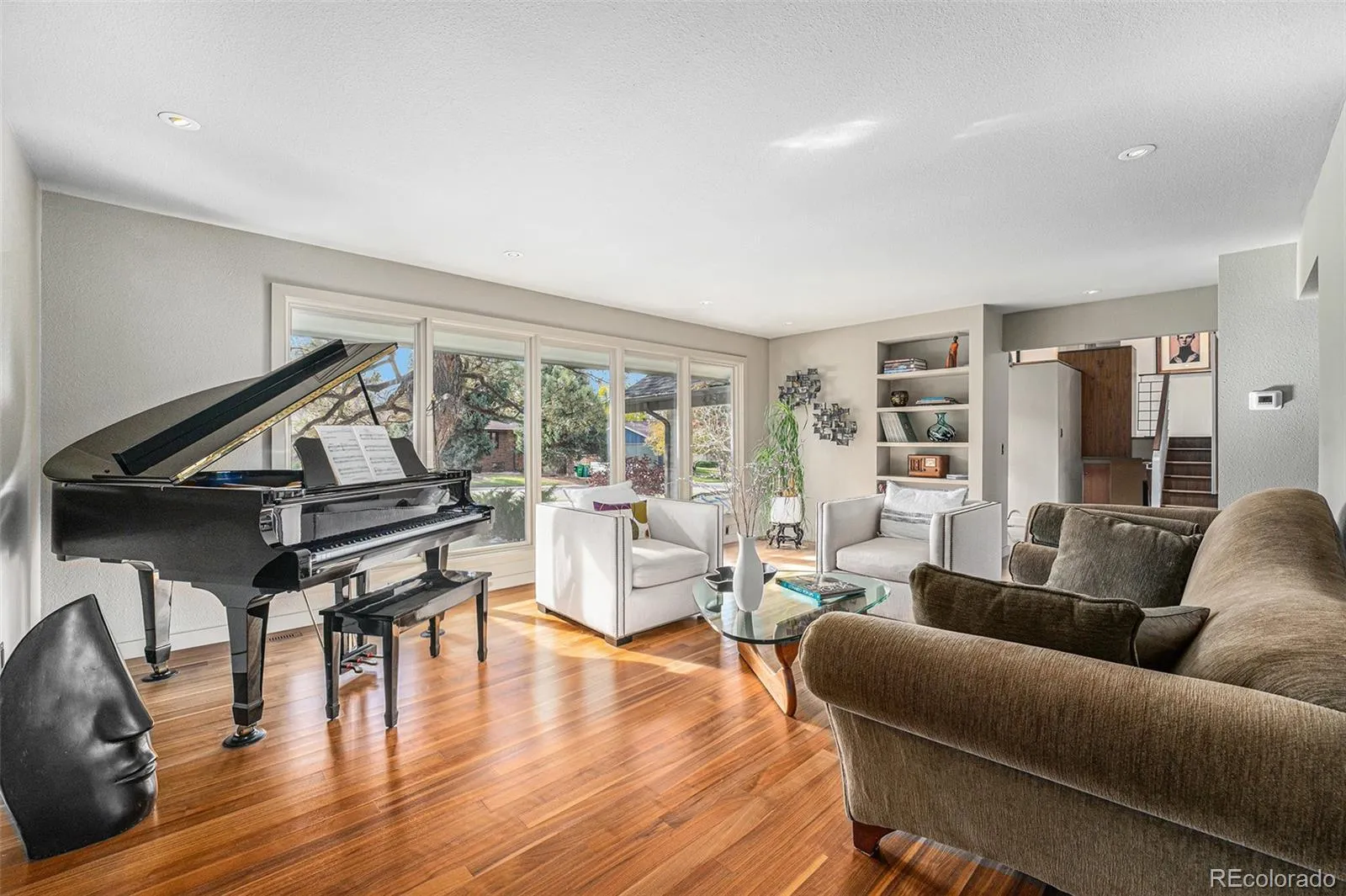 Rich walnut flooring flows throughout, leading to a chef’s kitchen adorned with granite counters, a custom granite backsplash, high-end walnut custom cabinetry, a professional gas range, and a wine rack. The formal dining room and gracious living area, complete with a grand piano, create the perfect ambiance for entertaining.