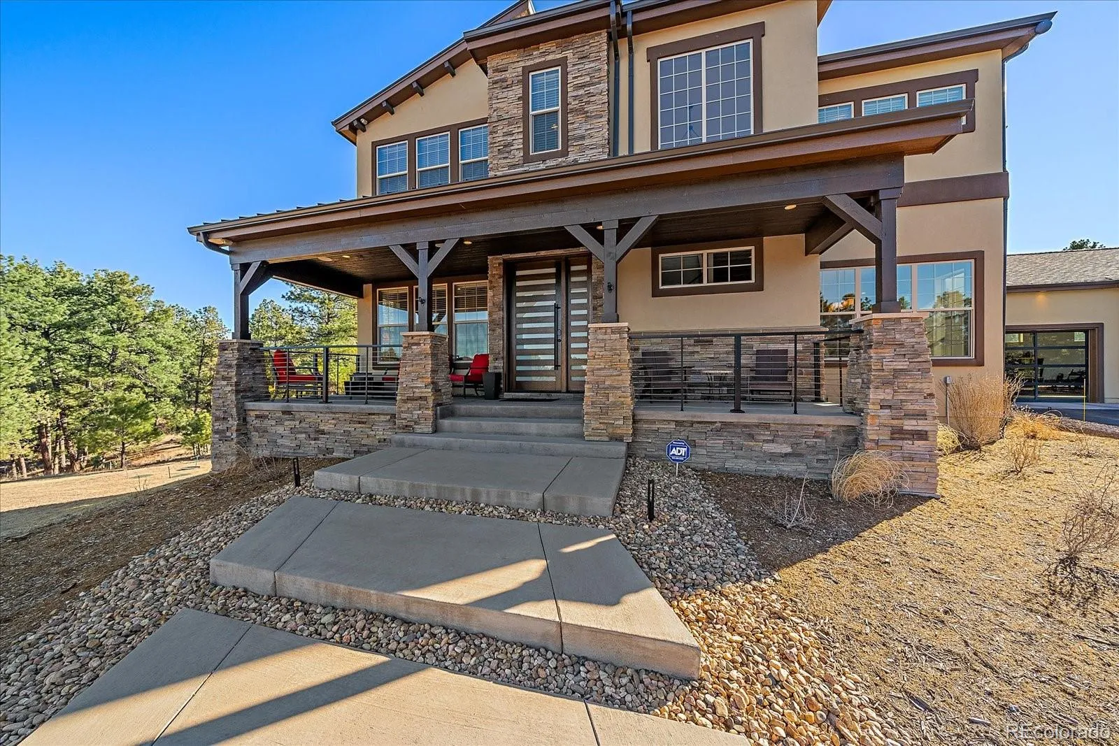 Set behind the gates of Preserve at Deerfield, this exceptional custom residence offers nearly four acres of privacy, luxury, & thoughtful design. Perfectly positioned for both tranquility & convenience, the home provides easy access to city essentials, DIA, & CO Springs Airport, making it ideal for buyers seeking a refined acreage lifestyle without sacrificing connectivity. This 4-bed, 4-bath home offers 4,054 fin sqft with room to expand, situated on a beautifully usable lot. A 3-car oversized garage includes a dedicated workshop, epoxy floors, interior drains, and direct yard access—perfect for hobbyists, or active lifestyles. The chef’s kitchen, featuring a spacious island with dual sinks, Thermador appliances including two dishwashers, 48″ cooktop with range hood, 54-bottle wine fridge, & double ovens. Quartz countertops flow throughout the home, complemented by furniture-style vanities and custom bathroom mirrors for a cohesive, elevated finish. Designed with both beauty & function in mind, the home showcases knotty alder beams, a striking mahogany front door, and a one-of-a-kind 1860s hand-cut reclaimed beams. Triplicating French doors seamlessly connect indoor/outdoor living spaces, while the great room windows are pre-wired for future automation. The mudroom provides a walk-in pantry with an Elfa system and pocket door, & dog run with 6’ fencing. The main-floor office features a custom barn door and hidden closet storage, ideal for secure files or a private vault. Outdoor living is equally impressive with a 24’x18′ herringbone deck, cable railing, drip irrigation for trees and landscaping —perfect for entertaining or quiet evenings under Colorado skies. The primary suite offers a five-piece spa bath with a freestanding tub, oversized shower, & a walk-in closet with built-ins. Other conveniences include an upstairs laundry room & loft. With basement framing already started for future expansion, this home offers immediate luxury and long-term flexibility.