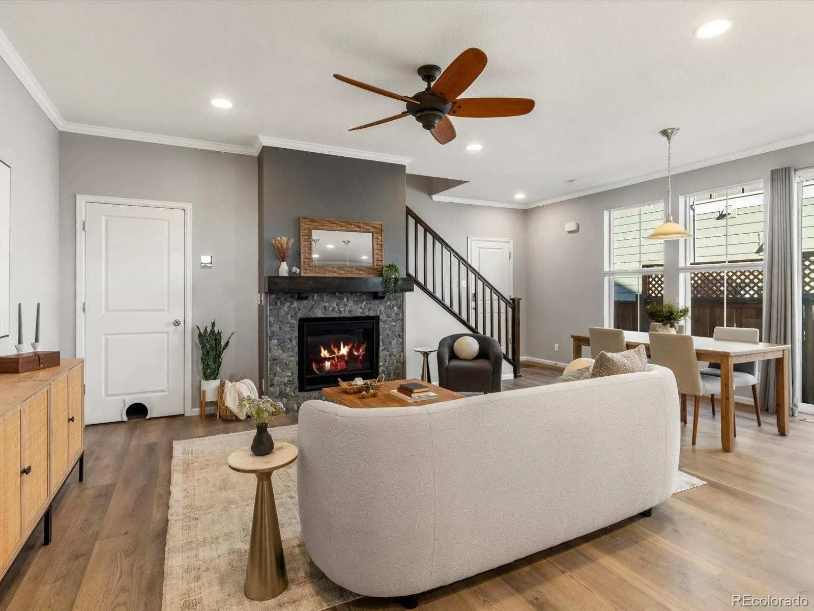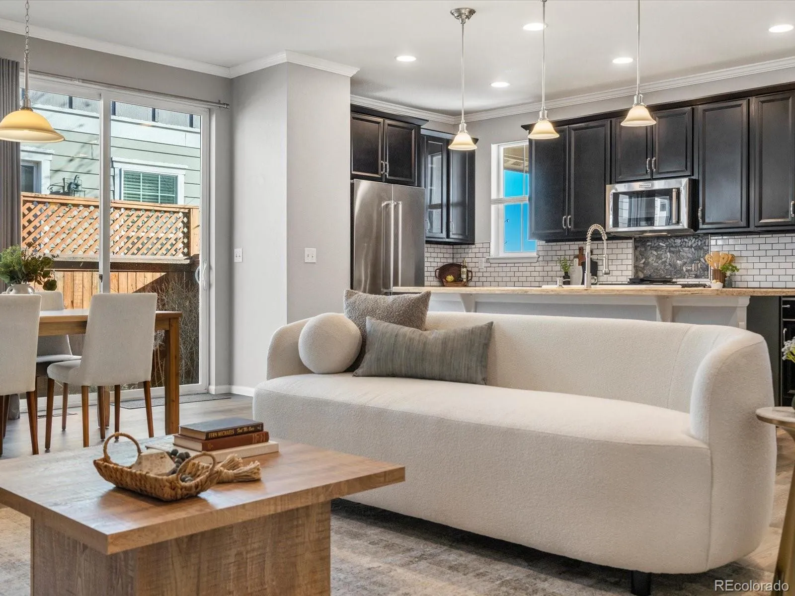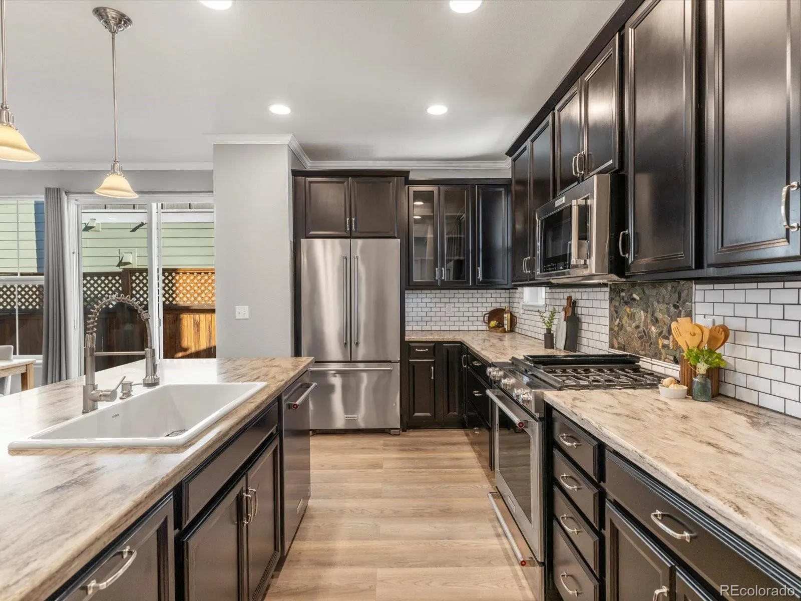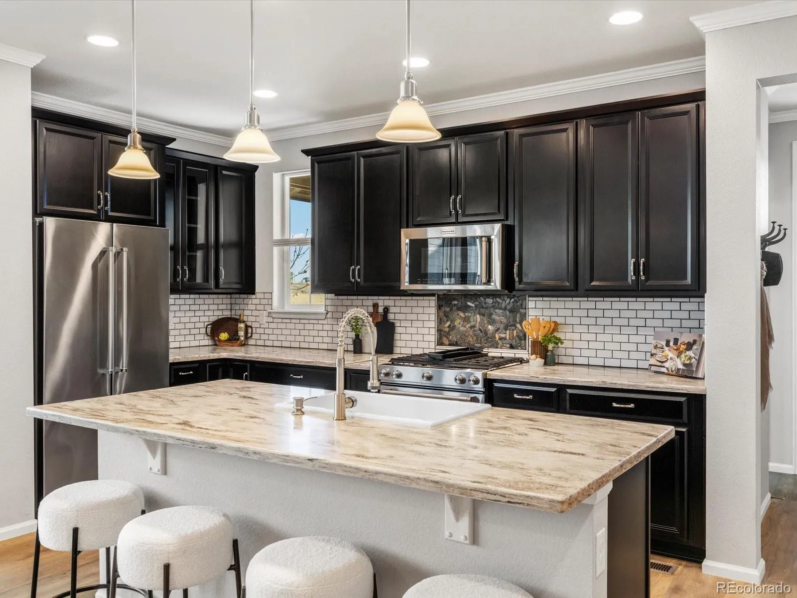 Welcome to this Central Park stunner that checks every box and then adds a few more just to show off. Bathed in sunshine thanks to its coveted southern exposure, this beautifully designed 2-bedroom + spacious loft, 3-bath townhome is thoughtfully upgraded, impeccably maintained, and truly move-in ready. From the moment you enter, you’ll feel how effortlessly this home lives. A convenient mudroom/drop zone welcomes you inside and flows seamlessly into an open-concept layout made for both everyday comfort and entertaining. At the heart of the home is a chef-worthy kitchen that absolutely delivers—featuring a gas range, upgraded stainless steel appliances, elegant crown molding, and a large center island that anchors the space and begs for gatherings. The living room is warm and inviting, centered around a cozy fireplace—perfect for Colorado winters and relaxed evenings at home. Luxury vinyl plank flooring on the main level and loft space keeps life easy, while plush carpeted bedrooms upstairs offer quiet comfort. The upper level unfolds into a spacious loft, ideal for a home office, second living area, or flex space, along with a guest bedroom and full bath, a convenient laundry closet, and an inviting light filled primary suite complete with a large WIC and spa-like bath featuring a soaking tub and separate shower w/ bench seat. Step outside to a smartly designed side-yard with a TREX deck, perfectly suited for Colorado’s four-season lifestyle—low maintenance, high enjoyment, and ready for summer BBQs or crisp fall evenings with friends. The finished garage offers abundant built-in shelving, keeping everything organized. The NEW roof brings peace of mind w/ hail resistant shingles. Location? Simply unbeatable. You’re steps from award-winning schools, neighborhood parks, scenic trails, and 3 of Central Park’s 7 community swimming pools.