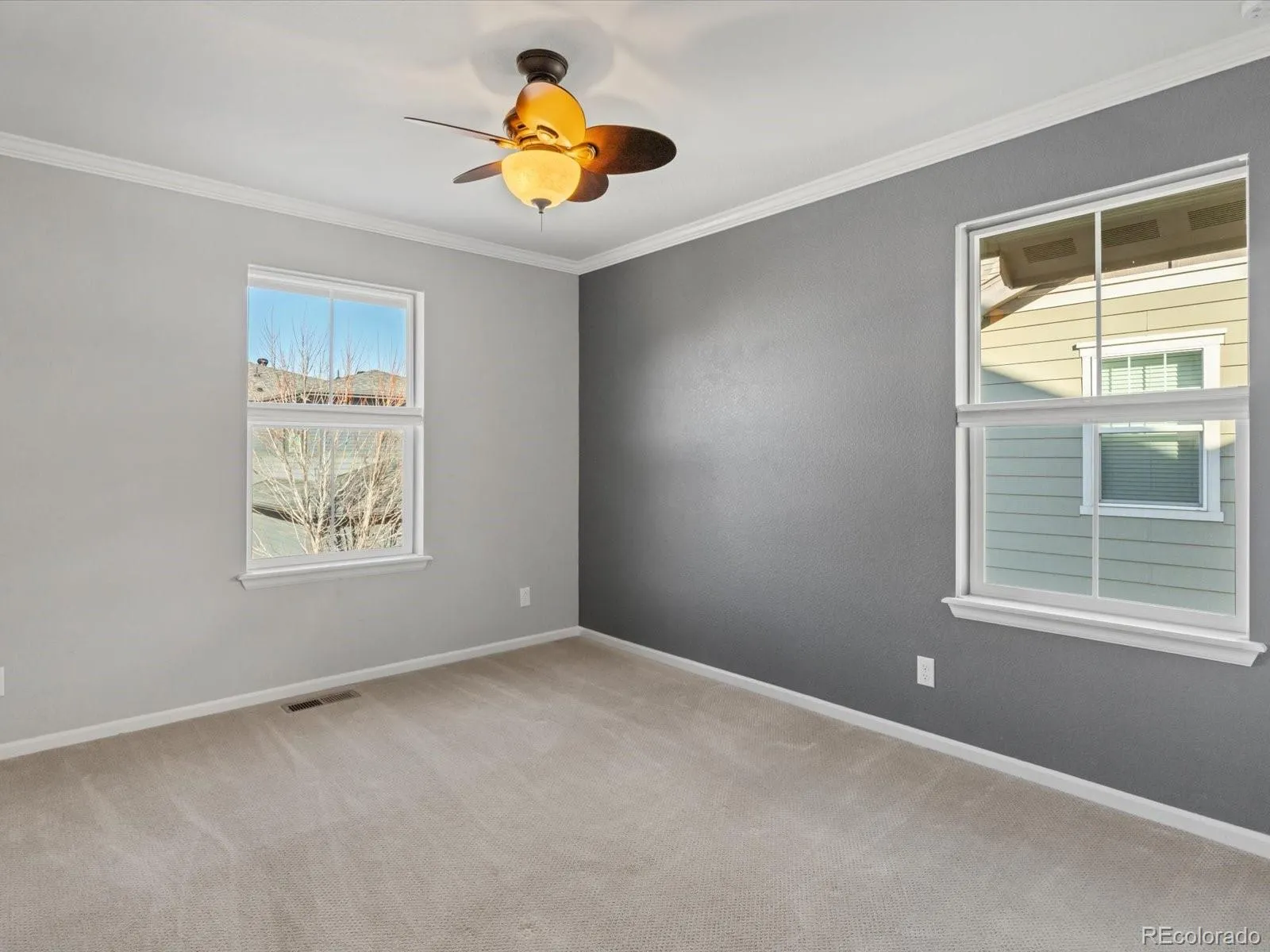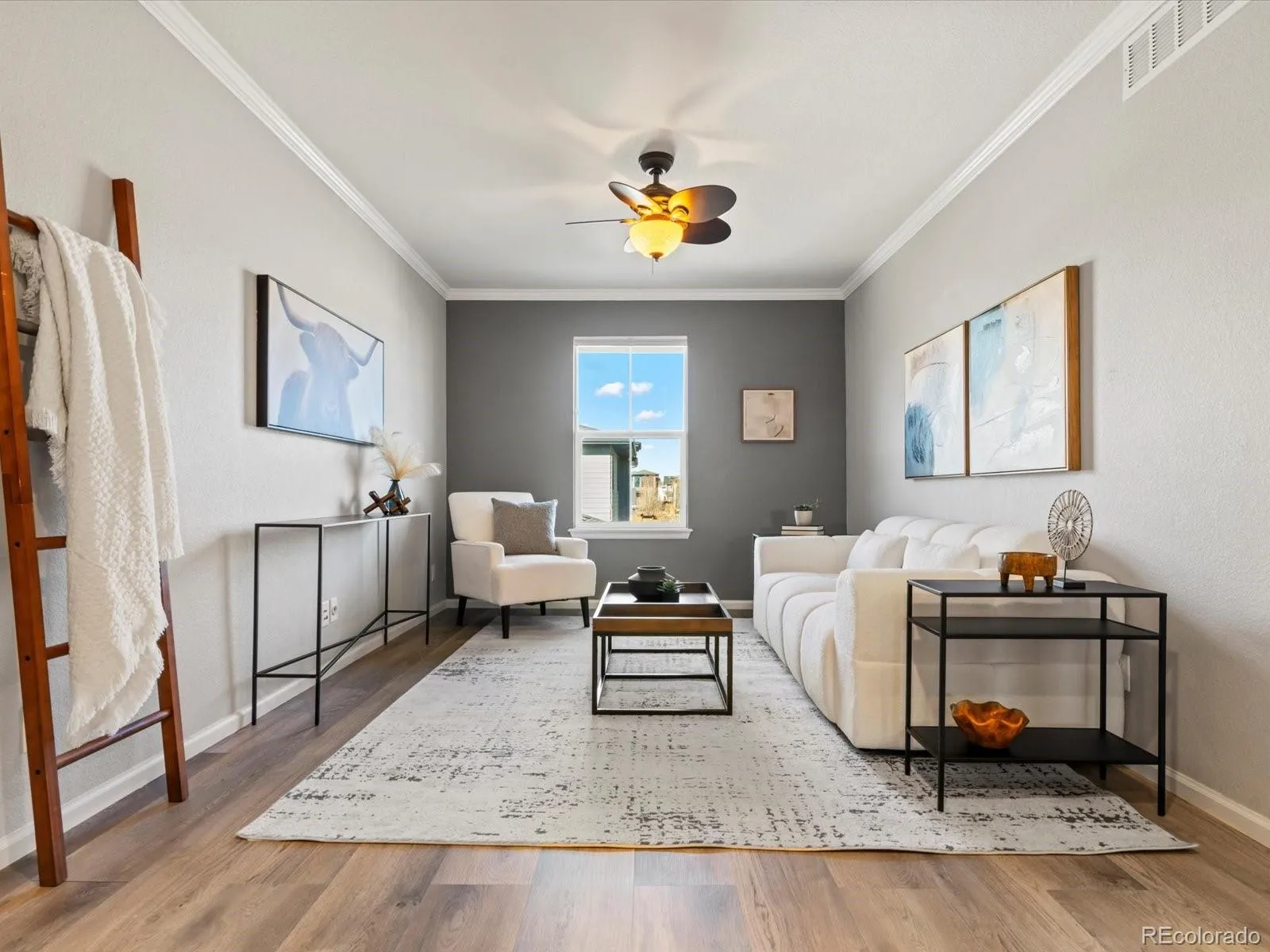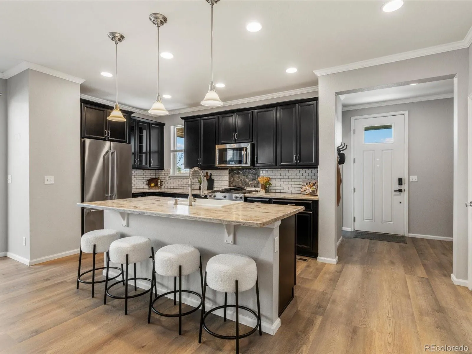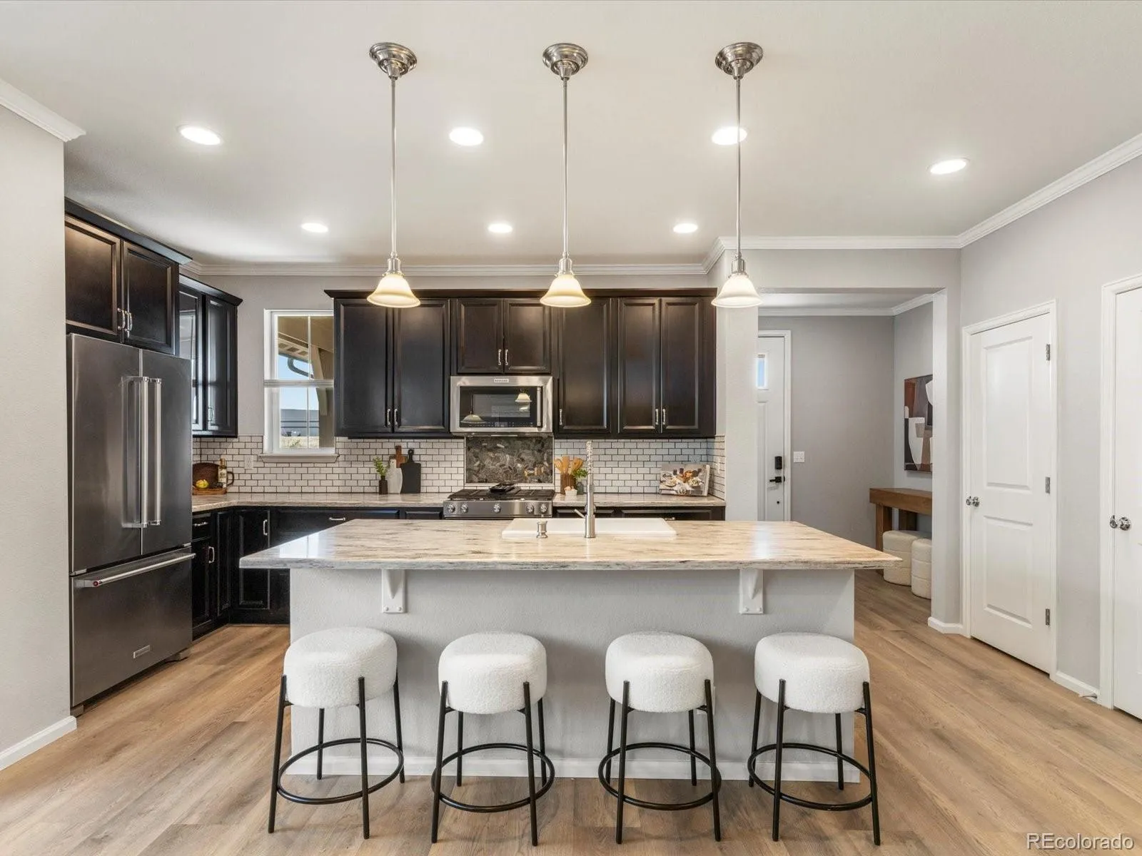 Welcome to this Central Park stunner that checks every box and then adds a few more just to show off. Bathed in sunshine thanks to its coveted southern exposure, this beautifully designed 2-bedroom + spacious loft, 3-bath townhome is thoughtfully upgraded, impeccably maintained, and truly move-in ready. From the moment you enter, you’ll feel how effortlessly this home lives. A convenient mudroom/drop zone welcomes you inside and flows seamlessly into an open-concept layout made for both everyday comfort and entertaining. At the heart of the home is a chef-worthy kitchen that absolutely delivers—featuring a gas range, upgraded stainless steel appliances, elegant crown molding, and a large center island that anchors the space and begs for gatherings. The living room is warm and inviting, centered around a cozy fireplace—perfect for Colorado winters and relaxed evenings at home. Luxury vinyl plank flooring on the main level and loft space keeps life easy, while plush carpeted bedrooms upstairs offer quiet comfort. The upper level unfolds into a spacious loft, ideal for a home office, second living area, or flex space, along with a guest bedroom and full bath, a convenient laundry closet, and an inviting light filled primary suite complete with a large WIC and spa-like bath featuring a soaking tub and separate shower w/ bench seat. Step outside to a smartly designed side-yard with a TREX deck, perfectly suited for Colorado’s four-season lifestyle—low maintenance, high enjoyment, and ready for summer BBQs or crisp fall evenings with friends. The finished garage offers abundant built-in shelving, keeping everything organized. The NEW roof brings peace of mind w/ hail resistant shingles. Location? Simply unbeatable. You’re steps from award-winning schools, neighborhood parks, scenic trails, and 3 of Central Park’s 7 community swimming pools.