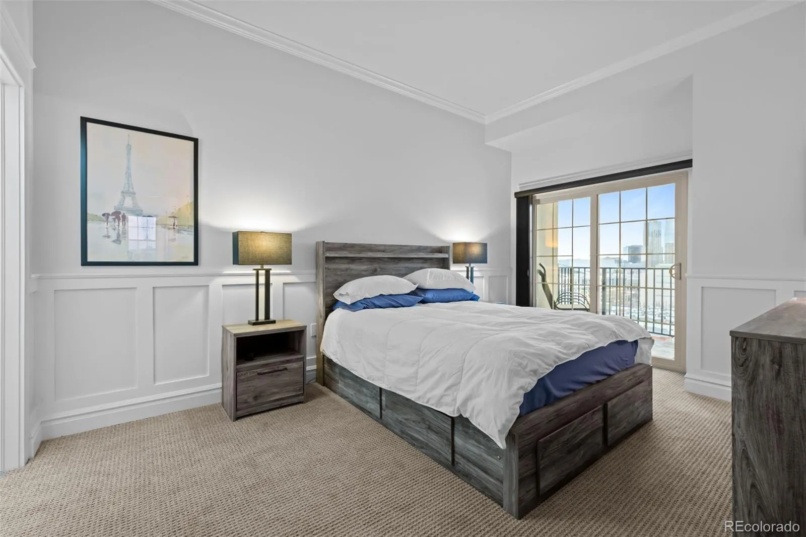 The William Ohs kitchen features top-tier appliances: Sub-Zero refrigerator drawers, a Thermador refrigerator and freezer, and a Fisher & Paykel 2-drawer dishwasher. Unique granite countertops, a Wolf oven and induction cooktop, and a convenient butler’s pantry make this kitchen a chef’s dream. The adjoining dining room offers stunning views of the city and Denver’s finest museums. All eleven windows and one of the patio doors were replaced last year and include custom Hunter Douglas shades. The flooring was replaced throughout as part of an extensive remodel in 2024. The wide-open floor plan—perfect for showcasing art—is completed with crown moldings, deep baseboards, and custom woodwork throughout this gorgeous home.