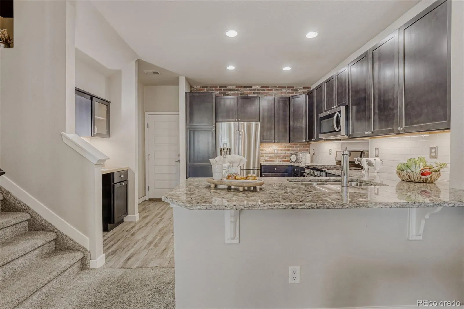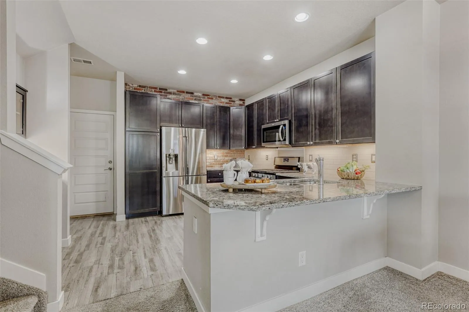 The large kitchen is thoughtfully designed with a custom backsplash, stainless steel appliances, a built-in desk, and abundant storage. A clean and convenient half bath completes the first floor.