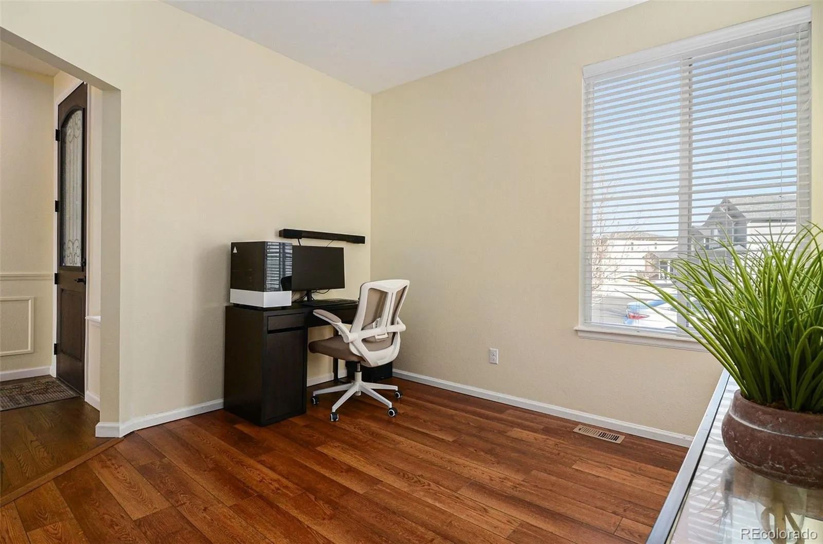 Welcome to this beautiful home offering a thoughtful layout and modern finishes throughout. Just inside the entry, a dedicated office provides a quiet workspace, while the bright living room features a sleek modern fireplace framed by built-in shelving. The kitchen is designed for both function and style with a spacious island and bar seating, a walk-in pantry, and an easy flow into the dining space. A main-floor bedroom adds flexibility for guests or multi-purpose use.