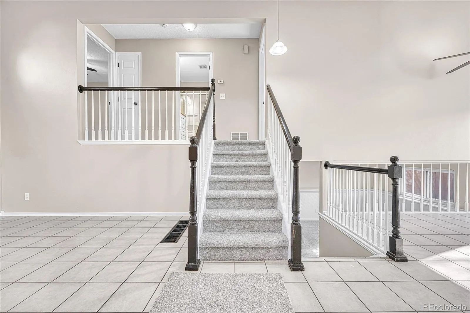 The split-level design adds architectural interest and separation of space, with an open railing overlooking the main living area. Large windows and skylights enhance the airy feel throughout the home.