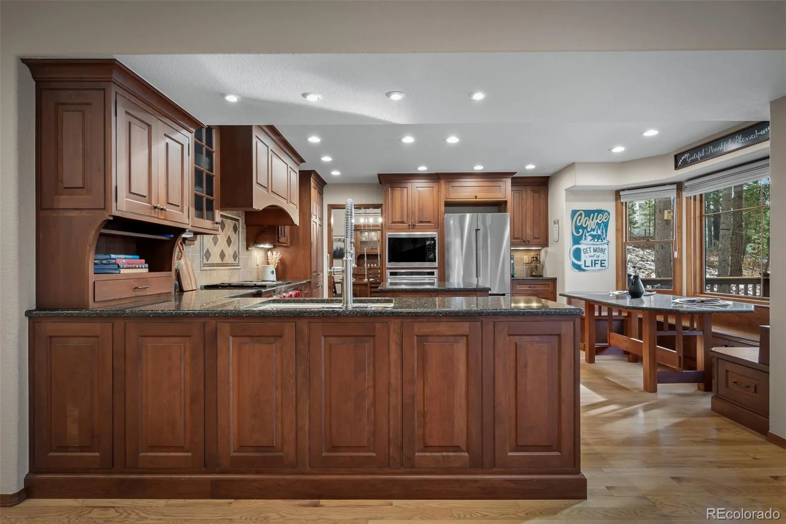 Nestled in the quiet Woodcrest of the Woodmoor neighborhood, this immaculate, meticulously maintained home sits on a generous .68-acre lot, offering a peaceful Colorado setting with the convenience of quick access to I-25. Located within the highly regarded Lewis-Palmer D38 School District, the home blends thoughtful updates with timeless comfort. Recent upgrades include updated bathrooms, fresh interior paint, new carpet, updated tile, modern lighting, a new roof with gutter covers, and two gas fireplaces that create warmth and ambiance throughout the home. The chef-inspired kitchen is a standout, featuring rich wood cabinetry, granite countertops, premium Wolf appliances, and an inviting eat-in kitchenette—ideal for both everyday living and entertaining. Enjoy outdoor living on the beautiful, peaceful deck, surrounded by mature Colorado landscape, or extend your living space into the walk-out basement, offering flexibility for guests, recreation, or multi-generational living. Set on nearly three-quarters of an acre, this home offers space, privacy, and exceptional care in one of Woodmoor’s most desirable settings. This is one of Colorado’s Finest.