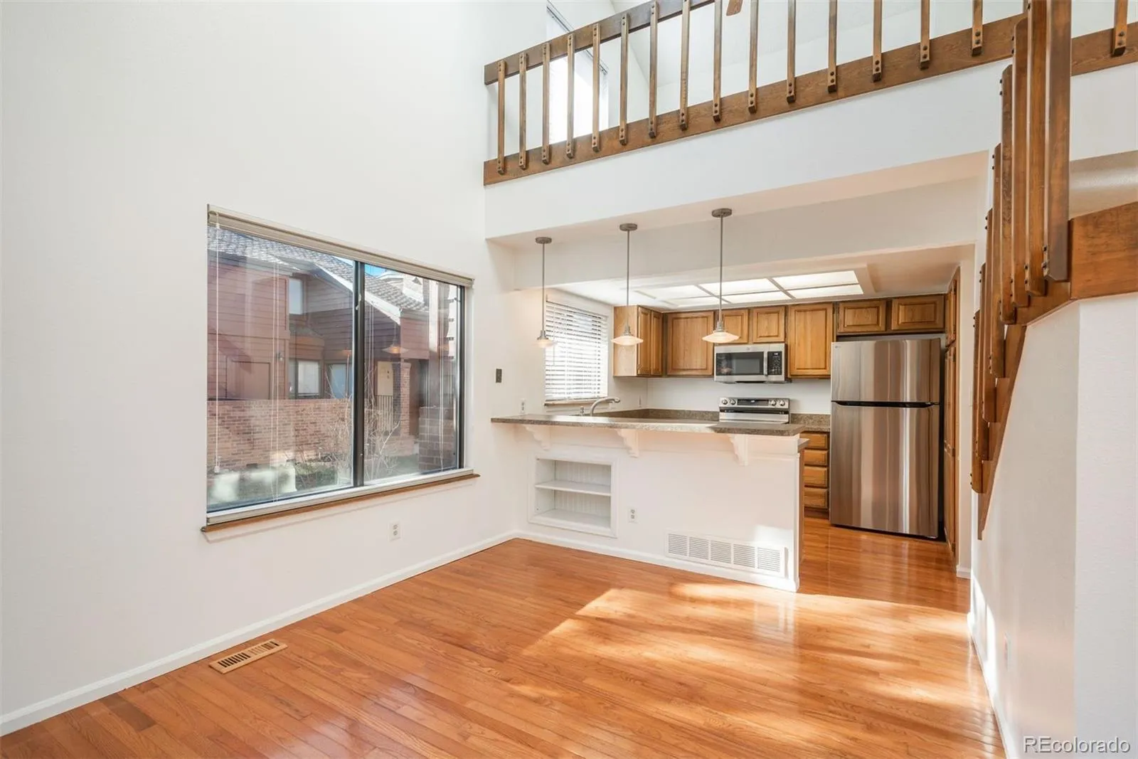 RARE END-UNIT- Freshly painted, light-filled townhome in the highly sought-after Beaumont Place! Soaring ceilings and an abundance of natural light welcome you into a modern, open-concept layout with hardwood flooring and new carpet that flows seamlessly throughout the main living areas. The kitchen features stainless steel appliances, plenty of cabinetry and a peninsula with plenty of room for seating. A main-floor bedroom offers flexible space for guests or a home office, complete with a generous closet and direct access to a full bathroom—ideal for visitors or remote work setups. Upstairs, the expansive primary suite is your private retreat. Enjoy a full bathroom with a large vanity, tiled shower, and plenty of natural light. A versatile loft space adds even more potential—use it as a cozy reading nook, a home gym, or easily enclose it to create an additional bedroom. The basement includes laundry space, is unfinished and ready for your imagination! eStep outside to your private patio—perfect for morning coffee or relaxing evenings. With a thoughtful layout and a prime location, this beautiful end unit truly checks all the boxes. Welcome home.