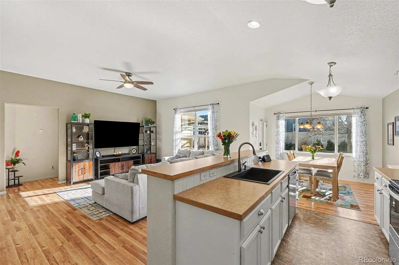 Welcome home to this charming and well-maintained ranch-style home featuring an open, functional layout and inviting finishes throughout. The bright kitchen offers ample cabinetry, stainless steel appliances and flows seamlessly into the dining and living areas—perfect for everyday living and entertaining. Vaulted ceilings and abundant natural light create an open, airy feel. The primary suite includes a spacious bedroom, private bath, walk-in shower, and generous walk-in closet. Additional bedrooms are well sized and conveniently located near a full bath. Enjoy easy main-level living plus added flexibility with a finished lower level offering additional living space—ideal for a family room, home office, gym, or guest area. Step outside to a private, fully fenced backyard with a patio. The covered front porch adds curb appeal and a welcoming touch, while the attached two-car garage provides everyday convenience. Located close to parks, trails, schools, and local amenities, this home offers comfort, functionality, and a great lifestyle opportunity. Move-in ready and a must-see!