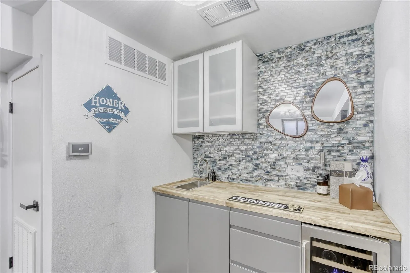 The finished basement adds flexibility and function with a built-out storage closet, wet bar with cabinetry, countertop, sink, and a 24-bottle wine refrigerator—ideal for entertaining or additional living space.