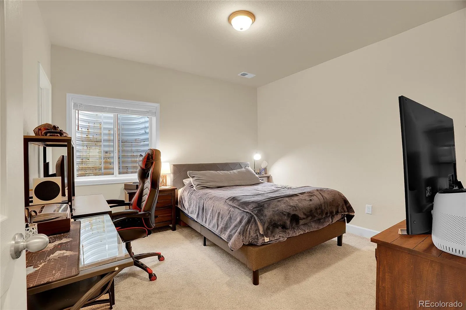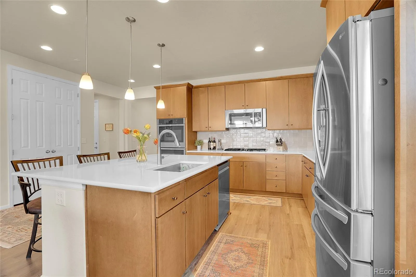 This stunning 5-bedroom, 3-bathroom ranch style home in Erie offers an unbeatable lifestyle. The expansive open floorplan flows seamlessly from the kitchen featuring sleek quartz countertops, high-end appliances including a sought-after double oven, into the cozy family room, perfect for everyday living and entertaining with surround sound installed. Step outside to the generous covered patio, which opens to open space and a walking trail, you can soak in breathtaking sunrises over the front range and watch colorful hot air balloons drift across the sky. It truly is an amazing sight. The spacious primary bedroom serves as a private retreat, while the finished basement will provide additional living space with its own surround sound set up and includes a wet bar offering flexibility for multiple entertainment areas. Additional highlights include and electric underground fence along with a heated garage. This is truly a must see!