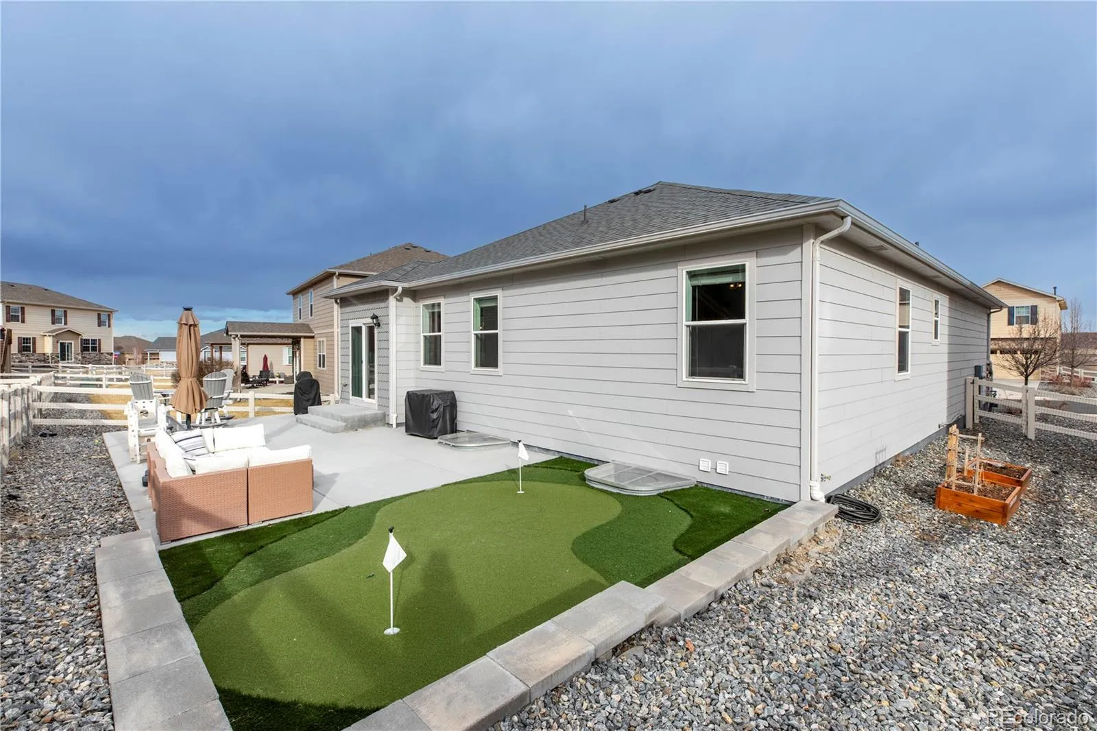 MOVE IN READY! Welcome to this beautifully upgraded ranch-style home with a fully finished basement—an exceptional find in this newer, family-friendly neighborhood. Offering 4 bedrooms and 3 bathrooms, this home seamlessly blends luxury finishes with functional living. The gourmet kitchen is designed to impress, featuring brand-new oven (that can turn into double ovens), range and dishwasher (October 2025), a new kitchen faucet, and an ideal layout for both everyday living and entertaining. All bathrooms have been refreshed with new faucets and shower heads. The finished basement—rare in this community—adds incredible value, providing expansive additional living space, a dedicated workout room, and a spa-inspired wet-room bathroom complete with a rain shower and soaking tub. Custom-designed closets throughout the home offer elevated organization and storage. Enjoy the ultimate indoor-outdoor lifestyle with a backyard completed in 2023 with a $35,000 custom renovation, creating a beautiful, low-maintenance retreat featuring a private putting green, ideal for relaxing or entertaining. Adding to the appeal, the home is directly across from a neighborhood park, offering open space and easy access to outdoor fun. Residents also enjoy a nearby community center with a pool, fitness center, and rentable community room, perfect for gatherings, celebrations, and year-round recreation. Ideally located just minutes from downtown Castle Rock, public and private golf courses, shopping, dining, and the Miller Activity Complex, this home offers space, style, and lifestyle in one of Castle Rock’s most desirable newer neighborhoods.