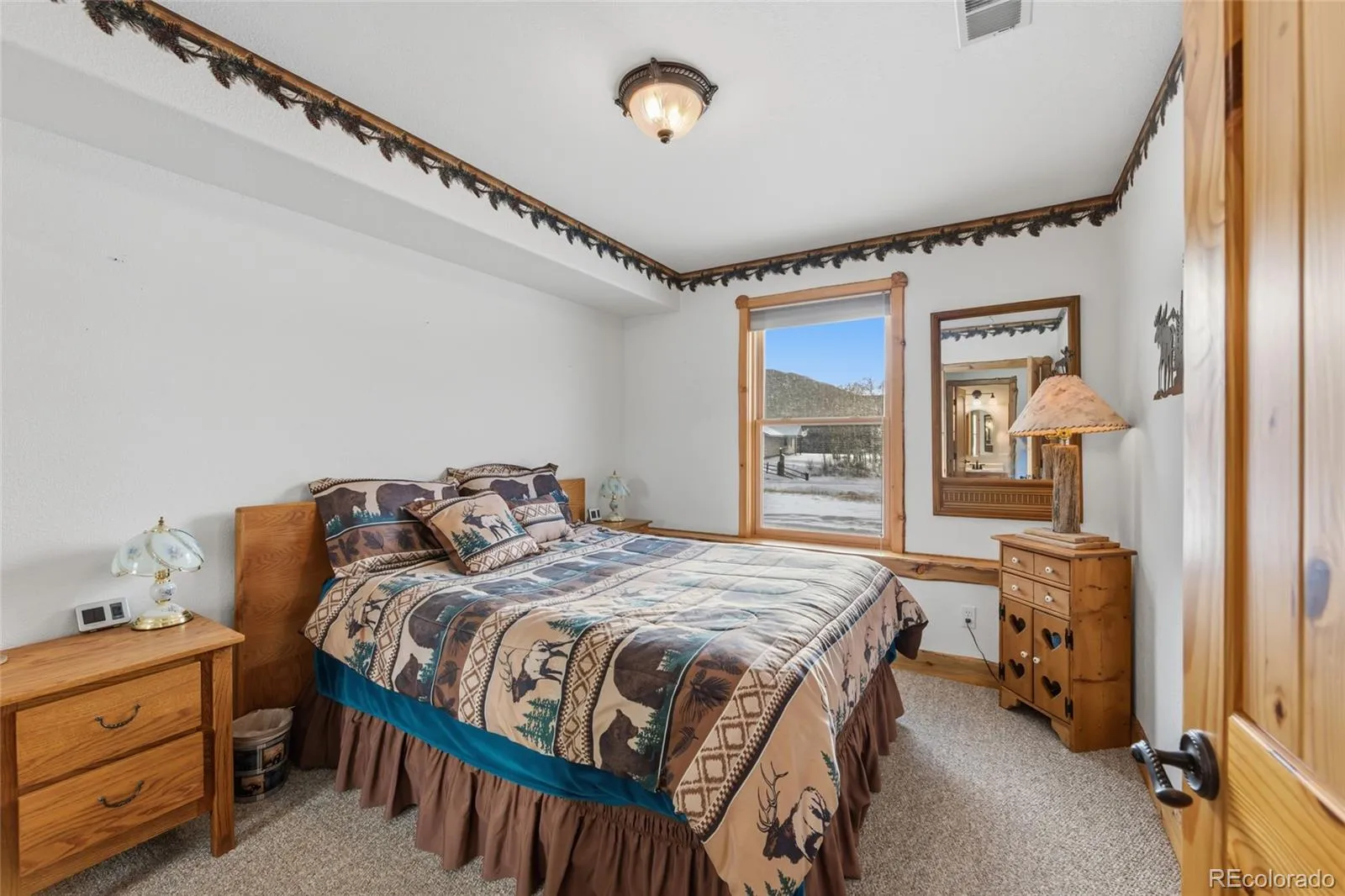 The stunning custom log staircase is crafted from natural timber, featuring thick solid-wood treads, rustic log railings, and a sculpted newel post that makes it a true architectural centerpiece with warm, lodge-style charm. Hand carved, live edge wood trim adds to the beauty.