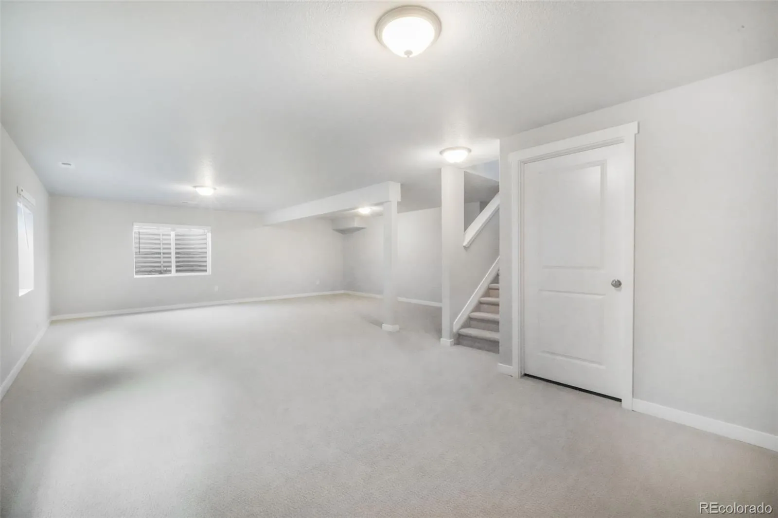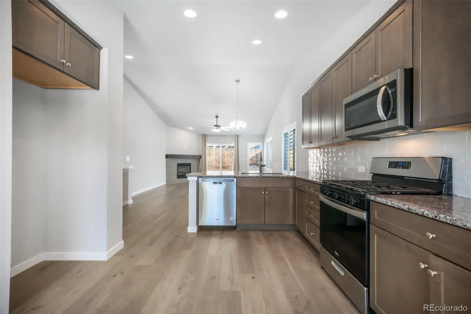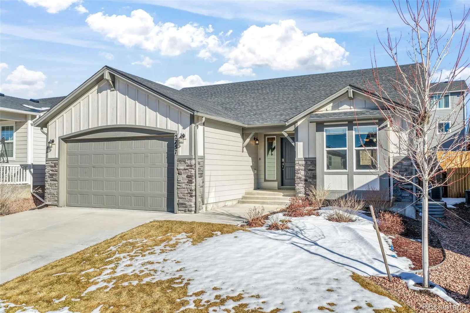 Amazing opportunity to purchase a like-new Classic Built Providence 2 ranch at an exceptional value. Built in 2022, this beautifully maintained home offers just over 2,700 square feet with four bedrooms and three bathrooms, all thoughtfully designed for comfort and functionality. You’ll be welcomed by stunning curb appeal featuring full landscaping, a stone exterior, and a covered front entryway. Inside, engineered wood flooring flows throughout the main level, leading to a spacious open-concept kitchen with granite countertops, stainless steel appliances, and ample cabinet space. The kitchen opens seamlessly to the living room, which features a tile-surround gas fireplace and access to the fully fenced backyard. Plantation shutters enhance the main-level living spaces, adding both style and privacy. The primary suite is generously sized and includes a large walk-in closet. The primary bathroom offers a beautifully tiled shower, granite countertops, and a private toilet room. An additional bedroom, full bathroom, and a convenient main-level laundry room with shelving complete the main floor. The finished basement provides a massive recreation room ideal for an additional living area, game room, or play space, along with two more bedrooms, a full bathroom, and a large mechanical room with excellent storage options. The backyard is well landscaped and includes window well covers for added safety and peace of mind. Located near shopping, dining, and with quick access to Peterson Air Force Base, this home is a short sale with outstanding equity potential. A rare opportunity to own a nearly new ranch home at an incredible price.