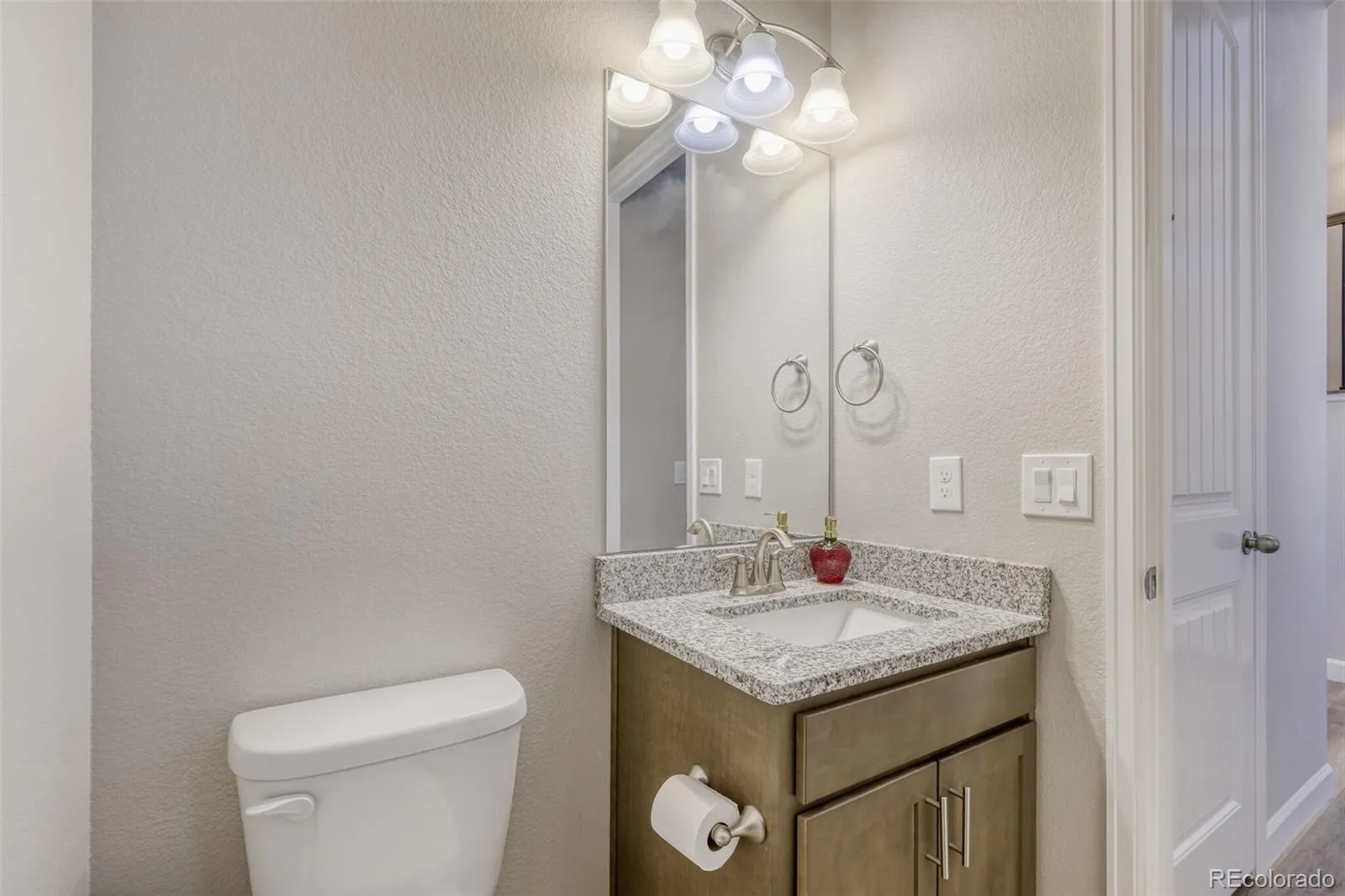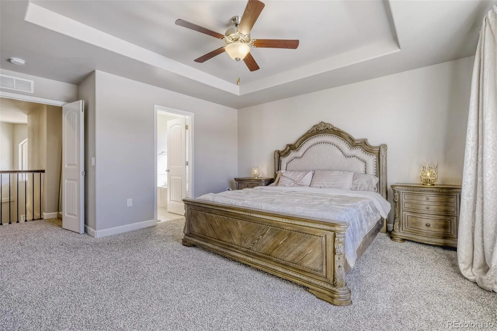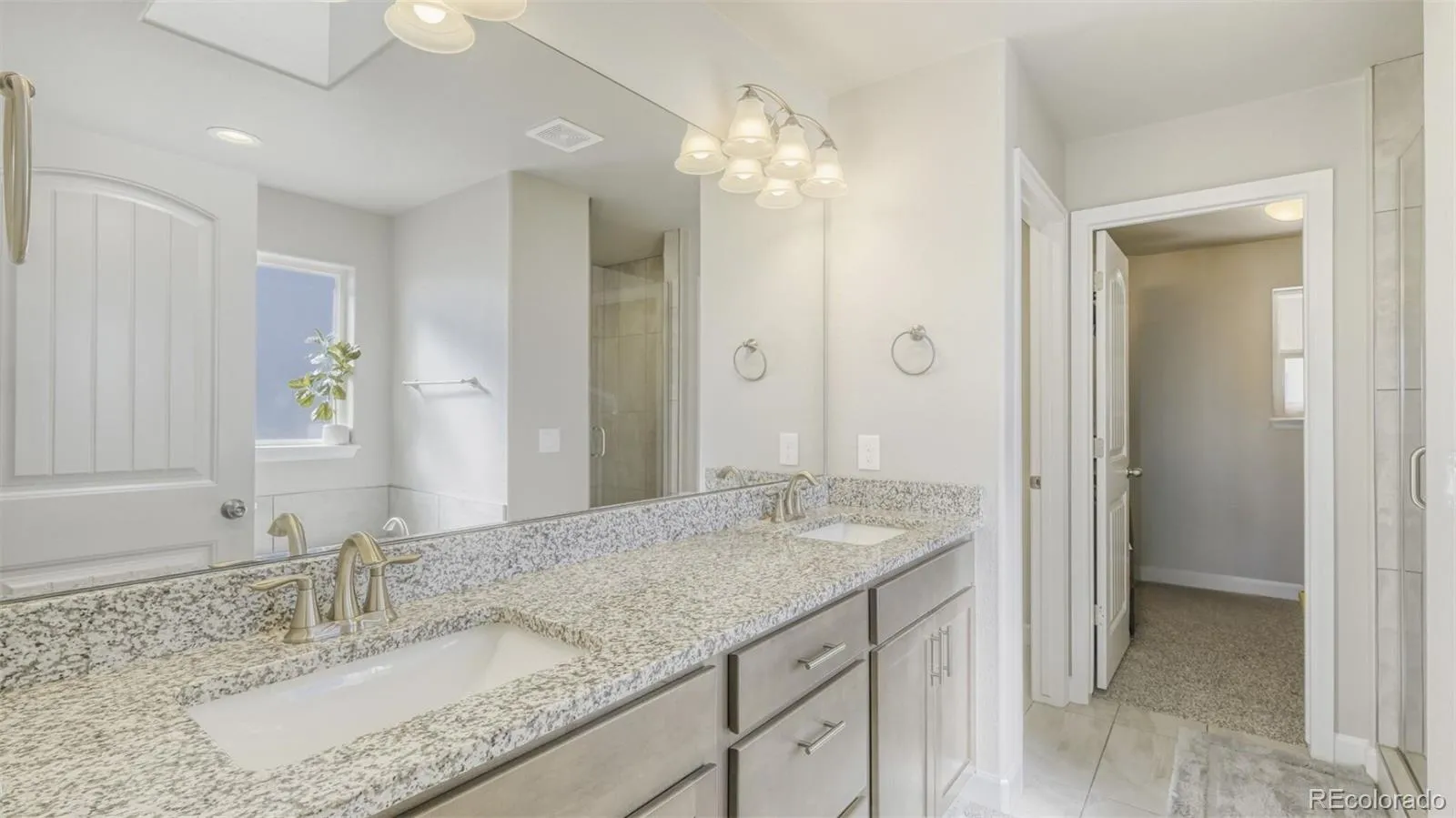 The chef-inspired kitchen showcases Samsung Energy Star stainless steel appliances, granite countertops, generous cabinetry, and seamless flow into the dining area. Upstairs, four bedrooms are conveniently located together, including the primary retreat featuring French doors, Pikes Peak/mountain views, and a spa-like en suite bath. An upper-level laundry room adds everyday convenience.