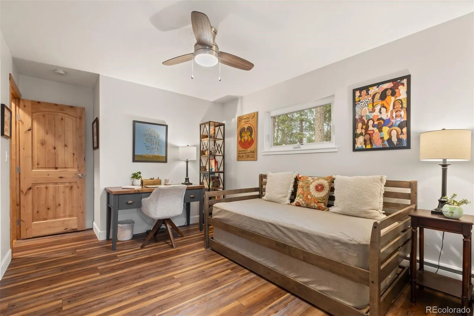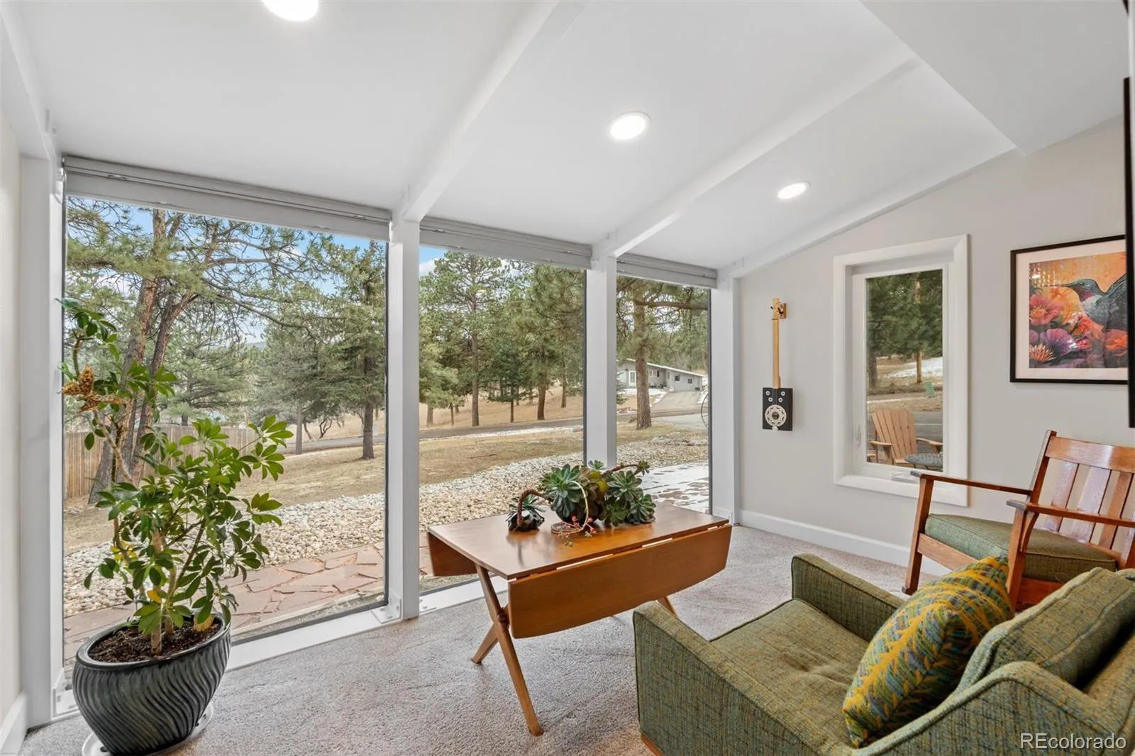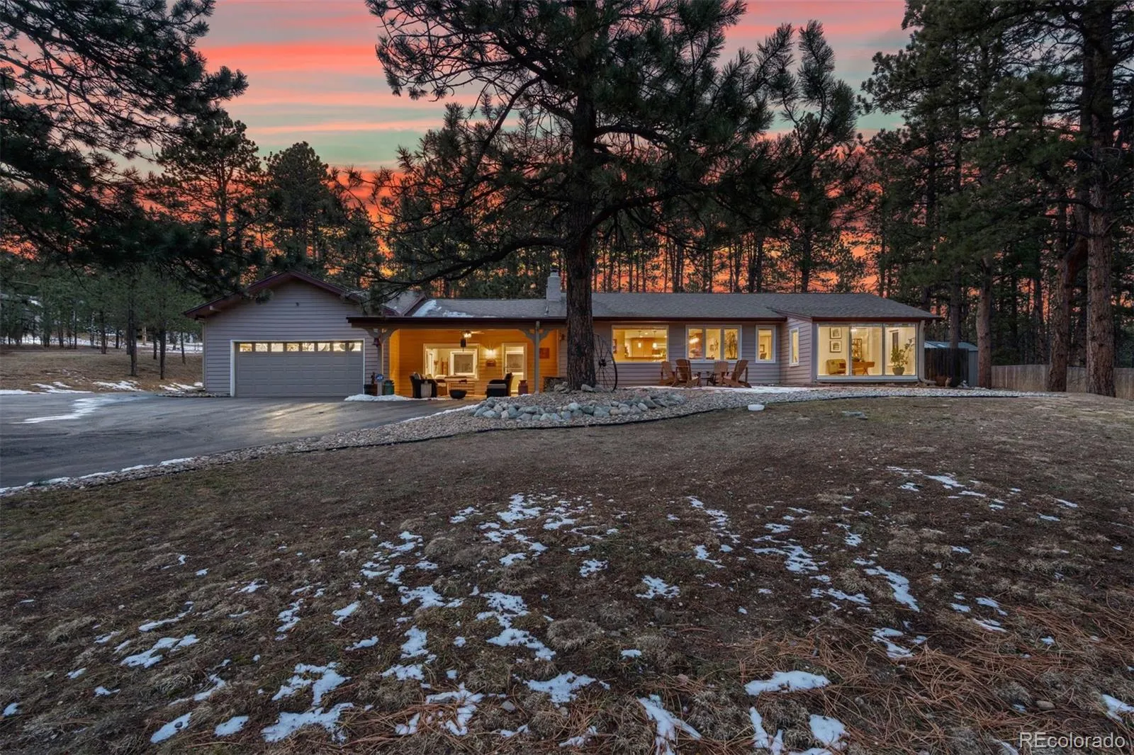 Welcome home! Nestled on a rare, flat, and beautifully manicured one-acre parcel in the heart of Evergreen, this exceptional 4-bedroom, 2.5-bath residence offers a refined blend of modern design, comfort, and mountain serenity. With just under 2,300 square feet of thoughtfully curated living space, the desirable ranch-style, main-floor layout lives spaciously while retaining a warm and cozy feel. Sunlight pours through newer oversized windows, illuminating clean lines, gleaming oak hardwood floors, and an airy interior throughout the main living areas. Designed for both everyday living and entertaining, the open-concept floor plan flows seamlessly and is anchored by the updated gourmet kitchen. The kitchen is a true centerpiece, featuring granite countertops, stainless steel appliances, an open bar for gathering, an under-sink reverse osmosis water tap, and direct access to the expansive rear deck.