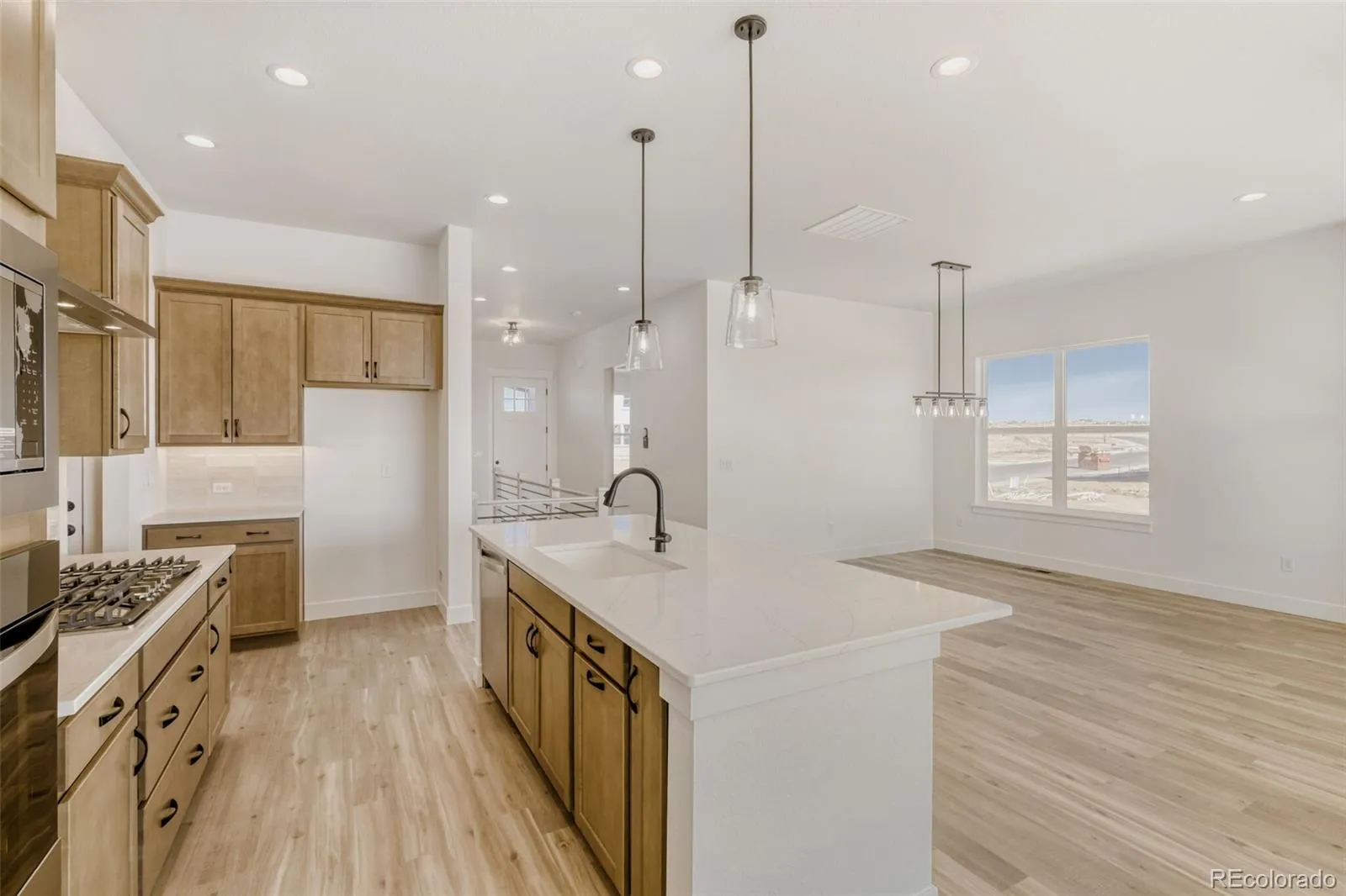 This open-concept ranch features 4 bedrooms, 3 full baths and an oversized 2-car garage, combining comfort and functionality in a thoughtfully designed layout. The spacious main level includes a cozy family room with a floor-to-ceiling fireplace, a gourmet kitchen with upgraded stainless-steel appliances, a large island and a bright dining area—perfect for hosting family and friends. Just off the main living area, you’ll find access to a covered outdoor living space, ideal for relaxing or entertaining. The main bedroom suite is bright and inviting, featuring a luxurious en suite bath with dual vanities, a walk-in shower and a generous walk-in closet. A guest bedroom and full bath are also located on the main level, along with a convenient laundry room near the garage entrance. Downstairs, the finished basement offers a spacious rec room, two guest bedrooms, a shared full bath and a stylish wet bar that adds to the home’s entertaining appeal. Additional upgrades include custom closets with built-in shoe racks, upgraded countertops and fixtures, a tankless water heater and a 96% efficiency-rated furnace.