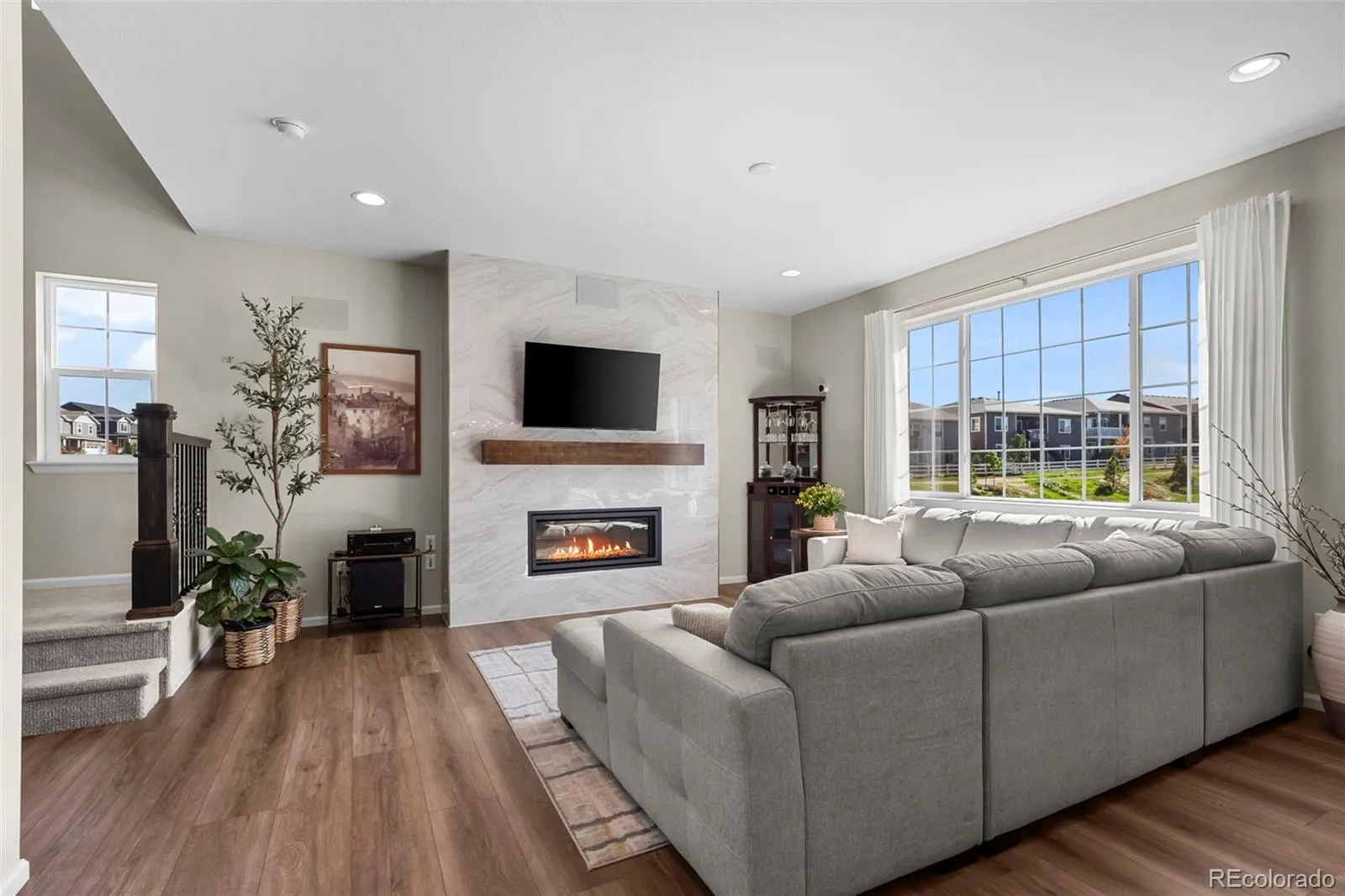 Step inside and be greeted by soaring ceilings leading to the bright, open great room, featuring a show-stopping accent wall and gas fireplace. The gourmet eat-in kitchen boasts custom pendant lighting, a large center island, quartz countertops, double convection ovens, a gas cooktop, and access to the covered deck—perfect for entertaining.
