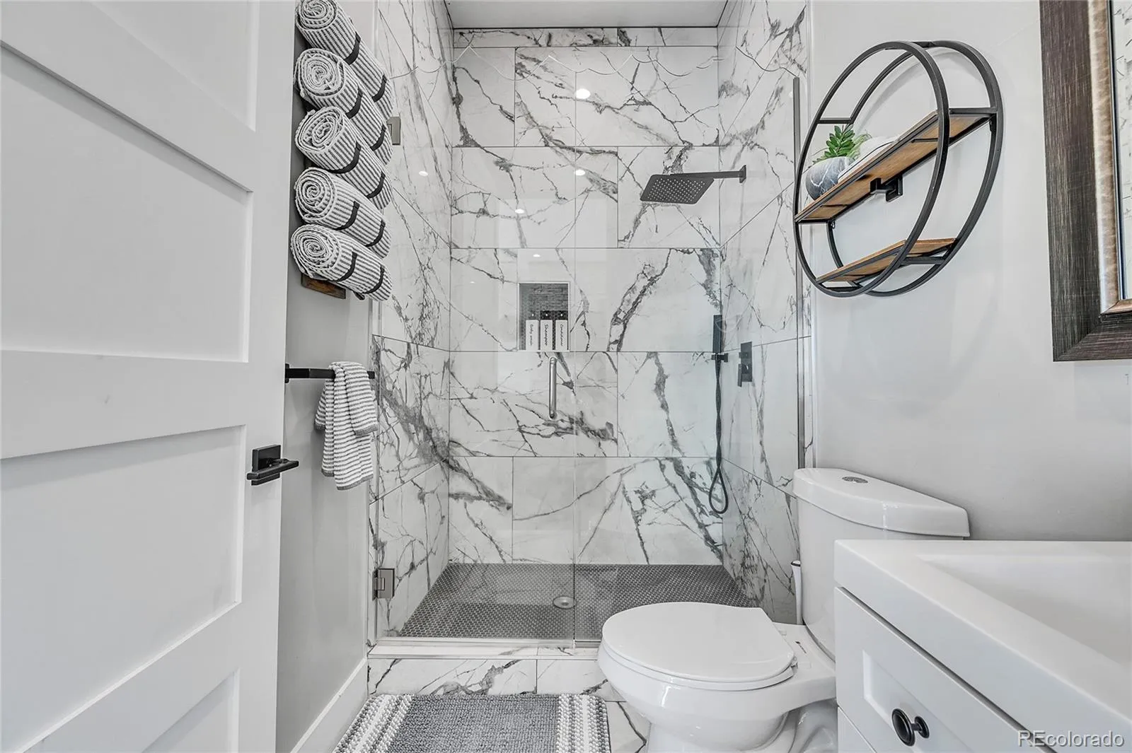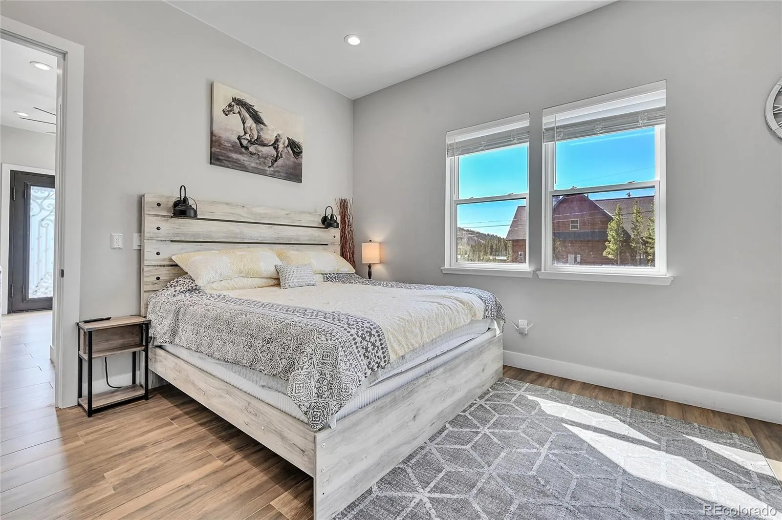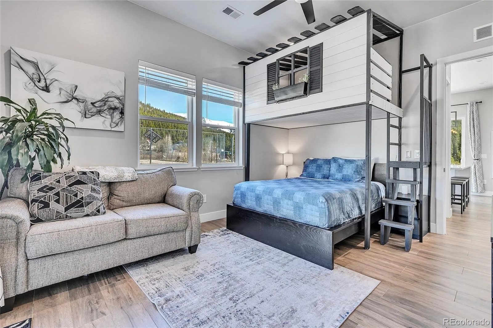 Inside, guests will love the open-concept layout with high ceilings, tall doors, and wood plank tile flooring throughout, creating a bright, modern mountain feel that photographs beautifully for listings. The stylish kitchen features a smart refrigerator, white quartz countertops, stainless steel appliances, range, microwave, and dishwasher, great for extended stays. The primary bedroom offers a relaxing retreat, the second bedroom’s built-in loft/bunk beds maximize sleeping capacity—an STR favorite. A spa-inspired bathroom with marble tile and a sleek, modern shower adds a touch of luxury. The cozy stone fireplace enhances the year-round rental appeal, especially during Colorado’s colder months.