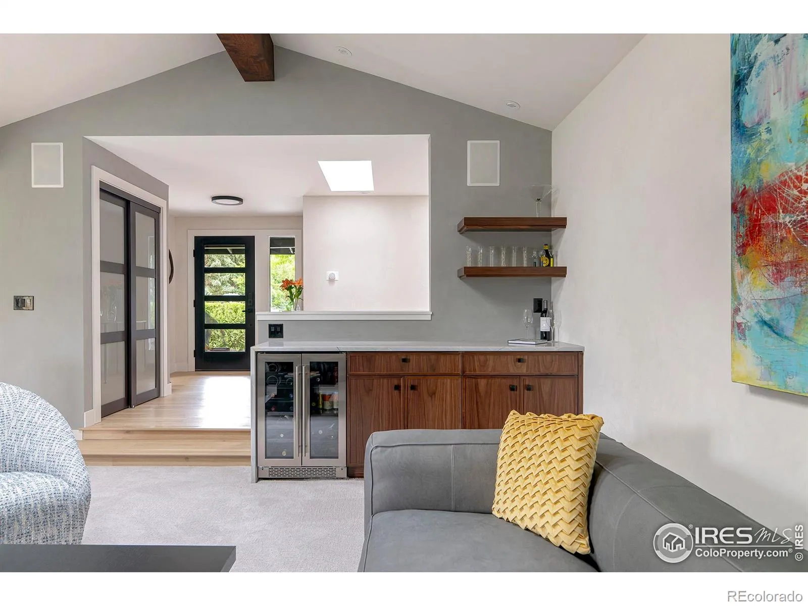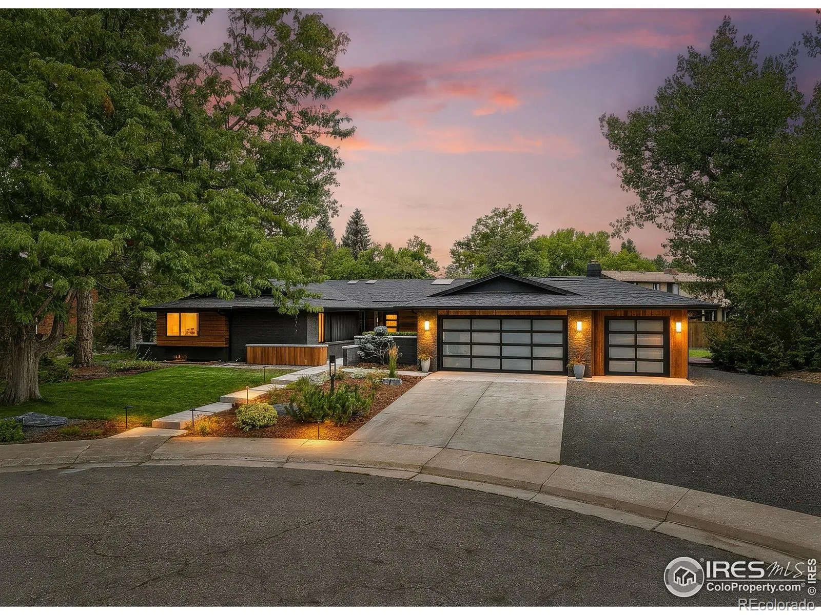 Warm, architectural, and effortlessly livable, this extensively renovated ranch offers a sophisticated reimagining of mid-century modern design in Boulder Country Club. Set on a quiet cul-de-sac, the home features stained brick, cedar accents, translucent glass garage doors, and mature landscaping-an understated introduction to the quality found within.Inside, vaulted ceilings and skylights bring in abundant natural light through expansive new Marvin windows, while handcrafted clay walls and wide-plank white oak flooring add warmth and texture. The living room is anchored by a custom gas fireplace, walnut beam, and elegant bar area.The kitchen is thoughtfully designed for both casual gathering and serious cooking, featuring a generous center island, rich walnut cabinetry, natural quartzite and quartz countertops, Thermador appliances, and imported tile accents. Adjacent living and dining areas offer open sight lines and natural flow. A light-filled family room features oversized picture windows, wood-paneled ceilings, and a sleek fireplace.The main-level primary suite is a private retreat with vaulted ceilings, a custom fireplace, spa-inspired bath with soaking tub, dual vanities, oversized shower, and an expansive walk-in closet. Three additional bedrooms provide flexibility for guests, home office, or creative use. The finished lower level includes sound-dampening ceilings, walnut acoustic panels, and a full bath-ideal for media, studio, or guest space.Outdoor living includes multiple patios and a landscaped, fenced backyard offering privacy and usability. A three-car garage with EV wiring and ample storage adds everyday practicality. Located in Boulder Country Club with championship golf, tennis, swimming, and social amenities just steps away, this residence exemplifies today’s Boulder luxury. Extensive renovations include a new roof, Marvin windows, electrical, HVAC, appliances, custom kitchen & baths, interior doors and baseboards, landscaping, and hardscaping.