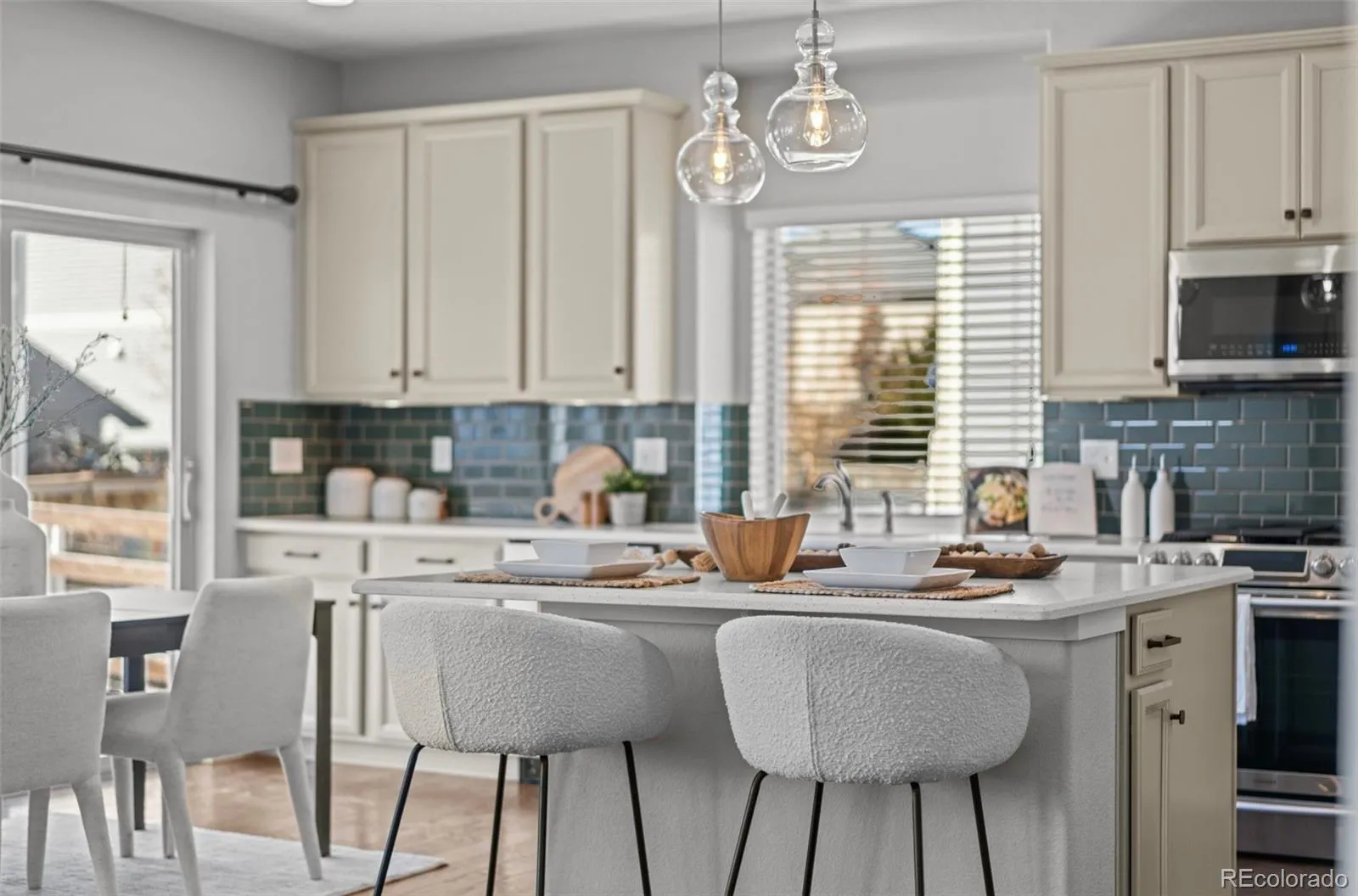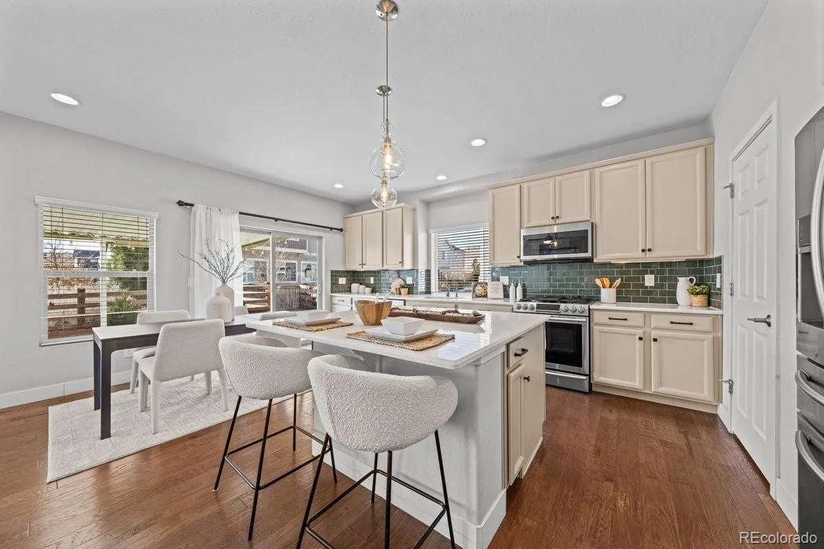 The open main level feels light and airy with high ceilings, an open-concept layout, and a south-facing wall of windows that fills the space with natural light. A true gourmet kitchen anchors the home with stainless steel appliances, a gas cooktop, quartz countertops, and stylish cabinetry, perfect for family meals, homework at the island, or hosting friends.