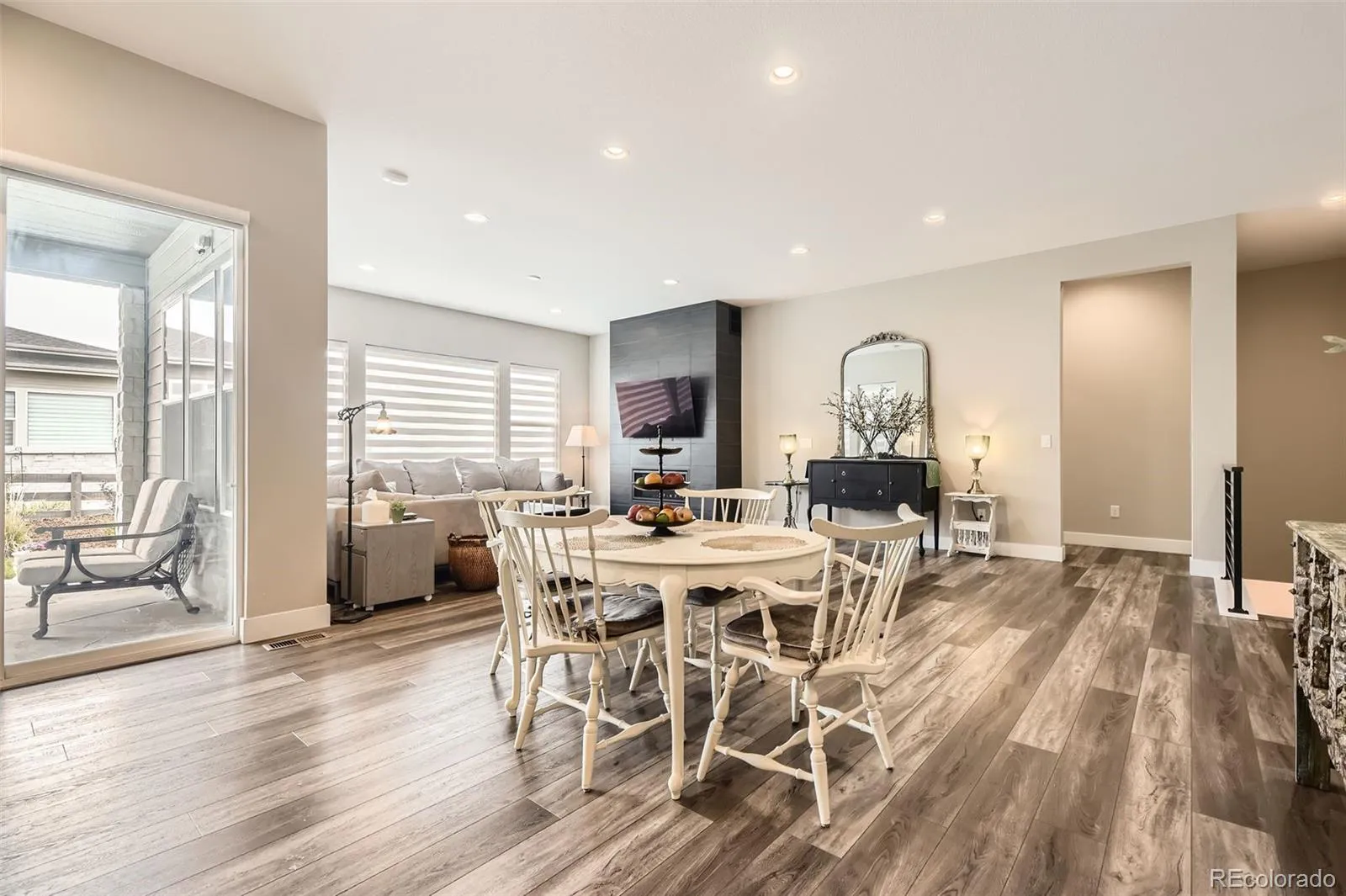 refined gas fireplace and the effortless convenience of automated luxury window treatments.