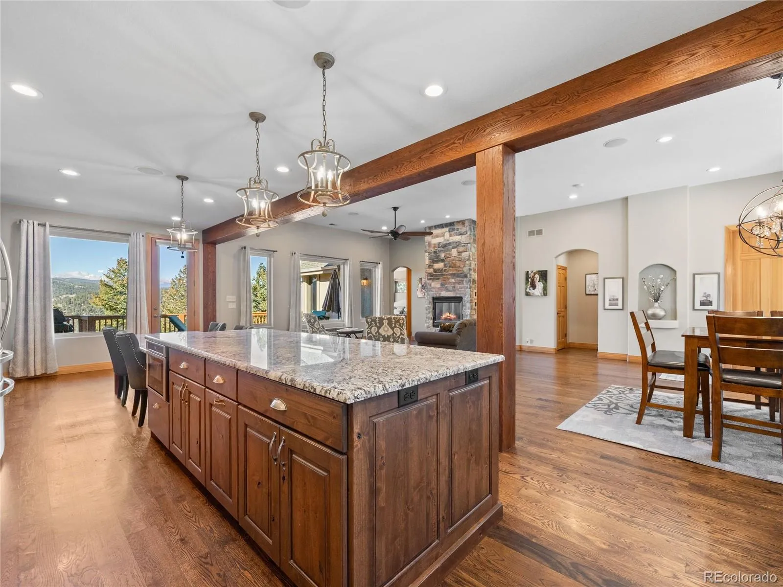 For the discerning mountain buyer, this exceptional southside residence offers a level of refinement, privacy, and modern comfort rarely found in the foothills. Built in 2003, it immediately sets itself apart in a market where many homes reflect an earlier era. True main-floor living anchors the home creating a sense of effortlessness, no compromises—just the luxury of living well on one level. The reimagined kitchen is a statement of craftsmanship and elegance, curated for both elevated entertaining and intimate gatherings, and flows seamlessly into a stunning great room accented by gleaming hardwood floors and abundant natural light. Facing west, the home captures Colorado at its most poetic. Evenings are defined by glowing sunsets, snowcapped peaks, and a quiet sense of awe best enjoyed from 1900 square feet of expansive deck space—perfect for entertaining under the stars or savoring a quiet morning coffee as the mountains awaken. Downstairs, the home transforms into an entertainer’s dream. A spacious family room with wet bar, beverage refrigerator, and dishwasher sets the stage for effortless hosting. An enclosed theater room—complete with all audiovisual components—delivers a true cinematic experience. The fully updated, enclosed in-ground hot tub offers a private spa-like escape, complemented by a full bath with steam shower. A bonus room provides ideal flexibility for a home office, gym, or creative studio. Practical luxury continues throughout: a flat newly sealed south-facing driveway, freshly painted low-maintenance stucco exterior; a new roof, new heating system, two new water heaters, and central AC. The heated three-car garage includes an EV charging station, blending modern convenience with mountain living. This home is not within an HOA, offering freedom that is increasingly hard to find in the area. This is mountain luxury without compromise—sophisticated, private, and impeccably maintained in one of Evergreen’s most coveted settings. See it QUICKLY!