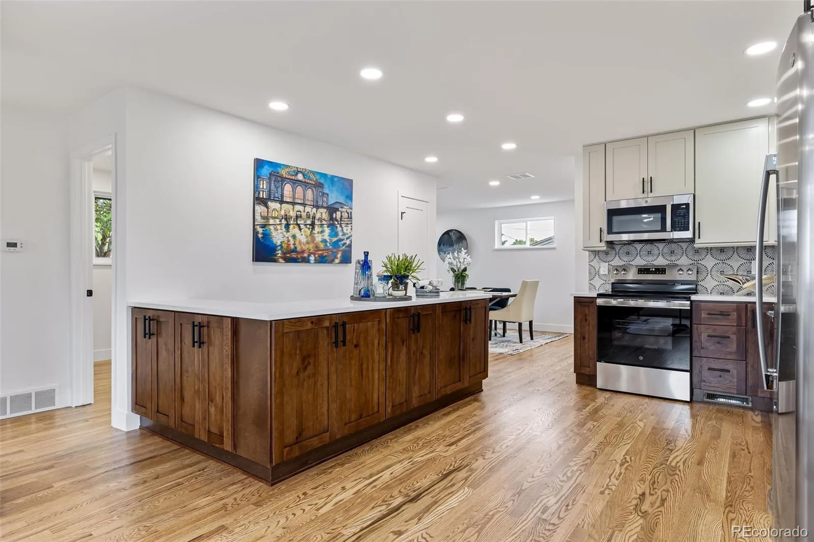 Welcome to this beautifully remodeled gem in the heart of Littleton. This fully permitted renovation offers the perfect blend of modern luxury and classic charm. Situated on a spacious 1/4 acre lot, this fully permitted remodel boasts all-NEW plumbing (pex), electrical, lighting, windows, Furnace, A/C and sleek hardwood flooring throughout the main level and new carpet in the basement. The heart of the home is the stunning kitchen with finishes chosen by a professional designer, featuring dual-tone birch hardwood cabinetry, quartz countertops, all new stainless steel appliances, tile backsplash, and a crafty island-style countertop for extra prep space and generous under-cabinet storage—ideal for everyday living and entertaining. Both bathrooms come with designer-choice tile and premium finishes. The basement bedrooms are both fully conforming and allow plenty of natural light. The former 1-car garage was converted to add valuable living space, maximizing functionality and square footage for flexible living arrangements, dining room, home office needs, or entertainment. The backyard shows off the lot size and is perfect for entertaining on the patio while admiring the oversized yard and mature trees. Let’s talk about LOCATION. This home is just a block away from the highly coveted Cherry Cricket restaurant, two blocks from the newly opened Littleton Brewing Company, and less than a mile from the light rail, South Platte River, and the vibrant shops and restaurants of Downtown Littleton. This is your chance to own a piece of historic Littleton—with all the modern conveniences and finishes.