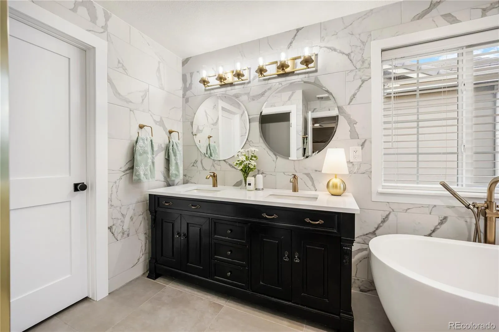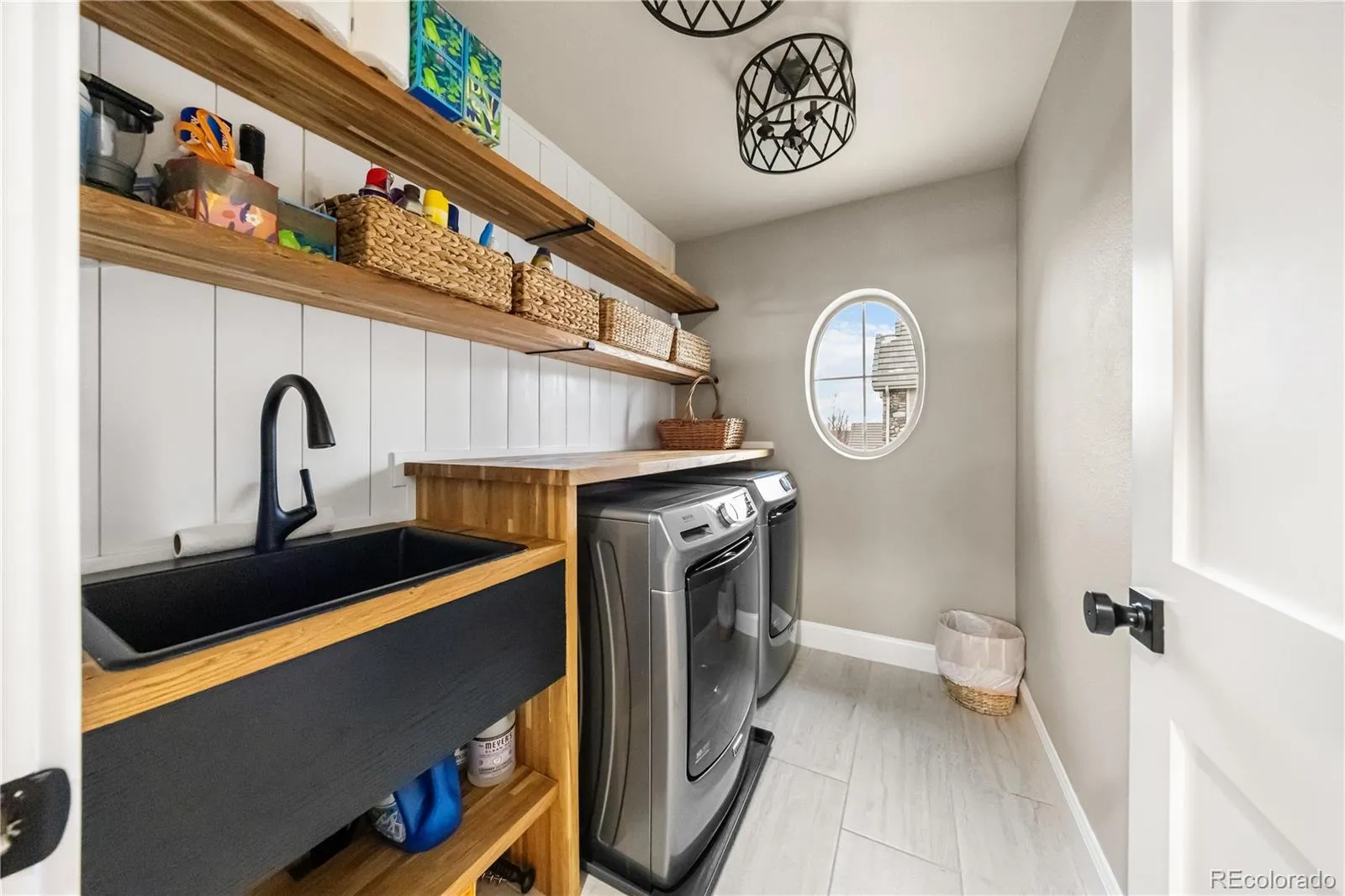 Upstairs includes a second living area, the primary suite, three additional bedrooms, a full bath, and a remodeled laundry room. The primary suite features a spa-inspired bathroom with a soaking tub, frameless glass walk-in shower with rain heads, double vanity, custom lighting, and a walk-in closet with built-in shelving.