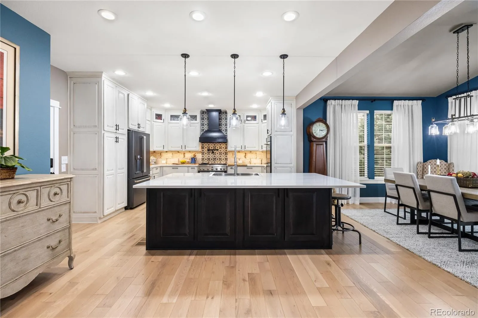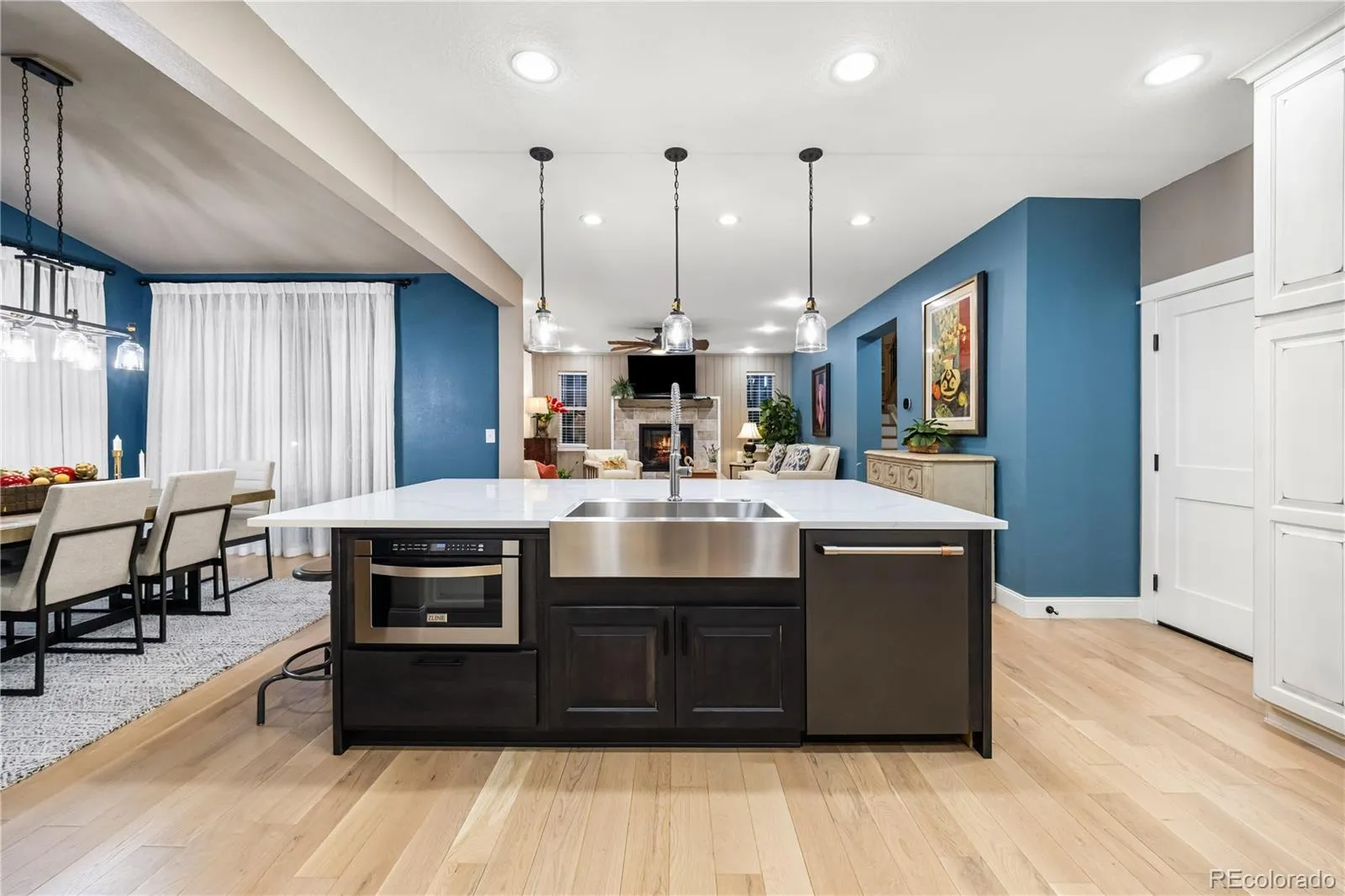 The gourmet kitchen is a true centerpiece with custom wood cabinetry, soft-close drawers, a full quartz slab island, apron-front sink, and Smart GE Café appliances, including a six-burner gas range, double ovens, microwave drawer, and refrigerator. Designer lighting includes under-cabinet lighting, pendants, and a statement chandelier.