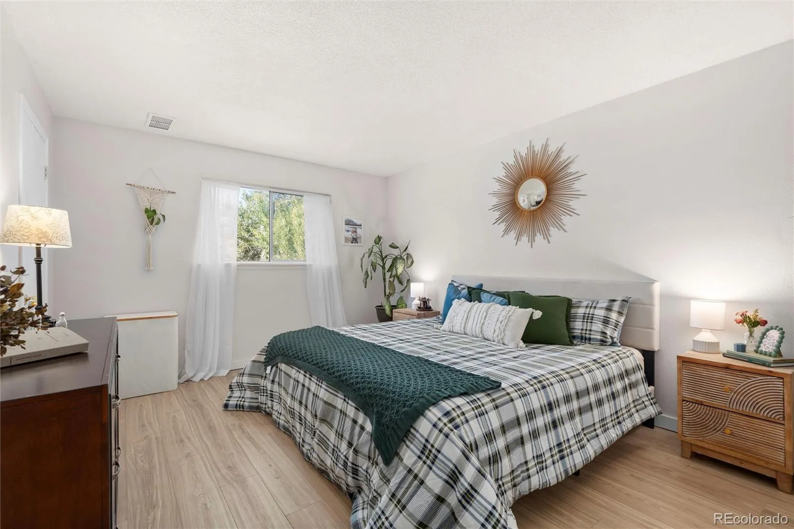 Upstairs, two spacious bedrooms—both with walk-in closets—share a refreshed full bath with new faucet, mirror, lighting, and flooring. The primary bedroom offers a peaceful retreat with direct bath access and ample closet space. The second bedroom includes a new ceiling fan and abundant natural light.