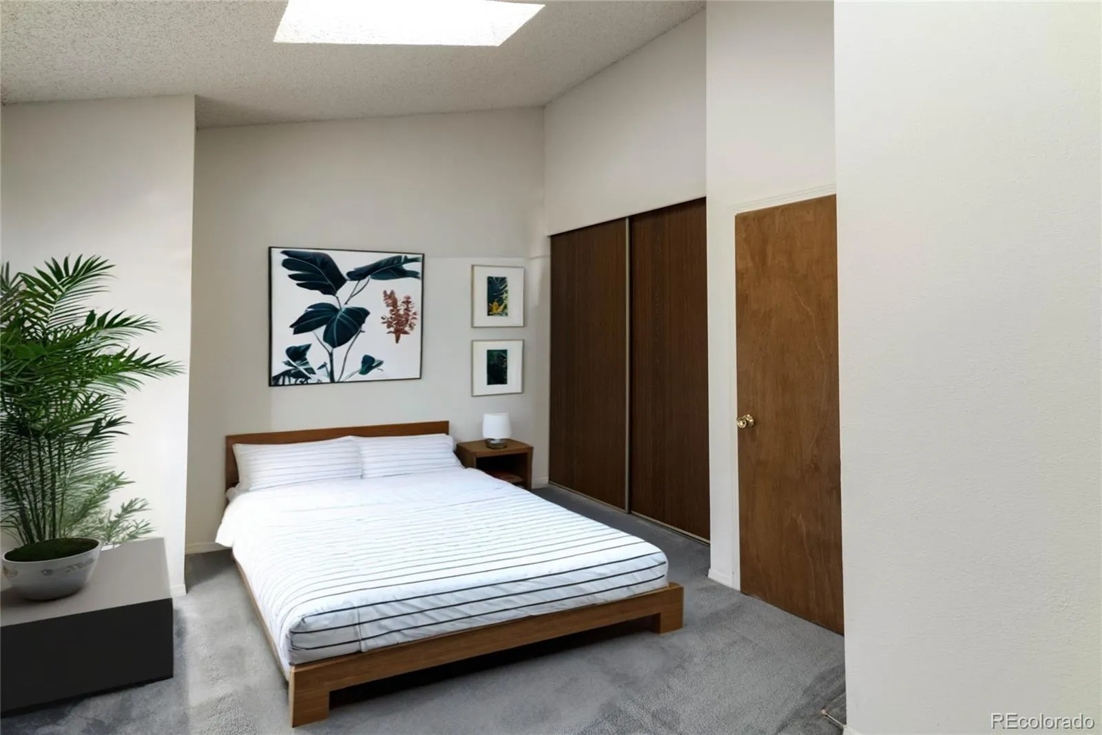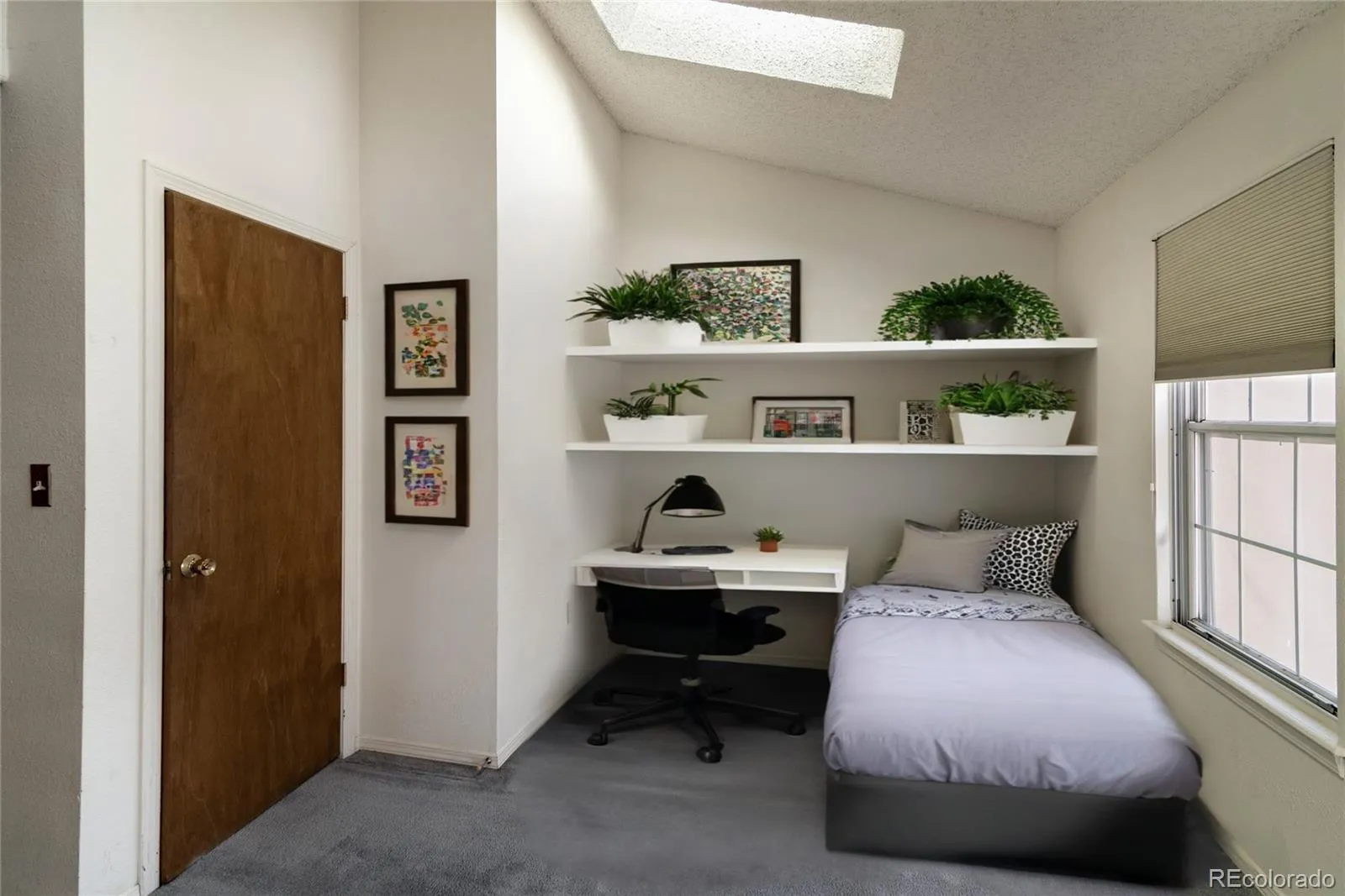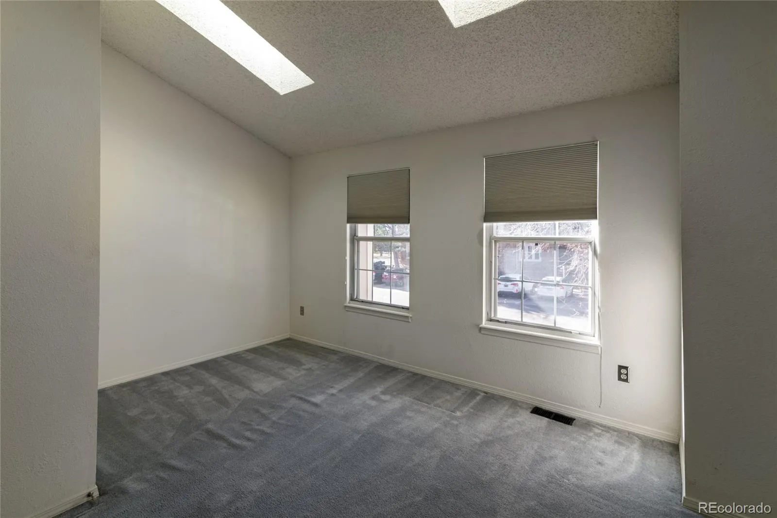 Upstairs, you’ll find two generously sized bedrooms. The primary bedroom features soaring vaulted ceilings that enhance the open, airy feel, abundant natural light, and a private en-suite bath. The secondary bedroom mirrors the vaulted ceilings and includes skylights, with a full bathroom located just steps away.