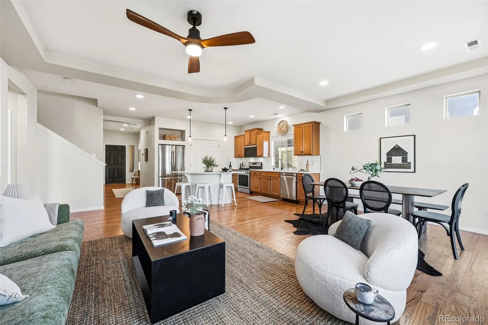 Welcome to this beautiful single-family home in the sought-after Erie Highlands neighborhood. This spacious property offers 4 bedrooms, 3.5 bathrooms, and a rare fully finished basement, providing ample living space and flexibility for every lifestyle. The model is notorious for flying off the market (and are rare to hit the market!). The main level features an open-concept layout that seamlessly connects the living room, dining area, and kitchen, perfect for entertaining or everyday living. The kitchen showcases new white quartz countertops, stainless steel appliances, and warm wood cabinetry for a timeless, updated look. The main floor primary suite includes an en suite bathroom; a second bedroom and full bath complete this level. Upstairs, you’ll find another bedroom, a half bath, and a versatile loft area ideal for a home office, playroom, or cozy retreat. The finished basement adds incredible functionality with a fourth bedroom, a full bathroom, comfortable living area with a fireplace, two large storage areas, and built-in cabinetry; great for guests, multigenerational living, or a recreation space. Step outside to the peaceful backyard, featuring a deck and a new stone patio, plus ample grass space. Enjoy all that Erie Highlands offers, including parks, trails, community pool, and convenient access to shopping and dining. A two car garage attached with luxurious epoxy coated floors. Additional perks: New roof (2023), new stucco and exterior paint (2022)!